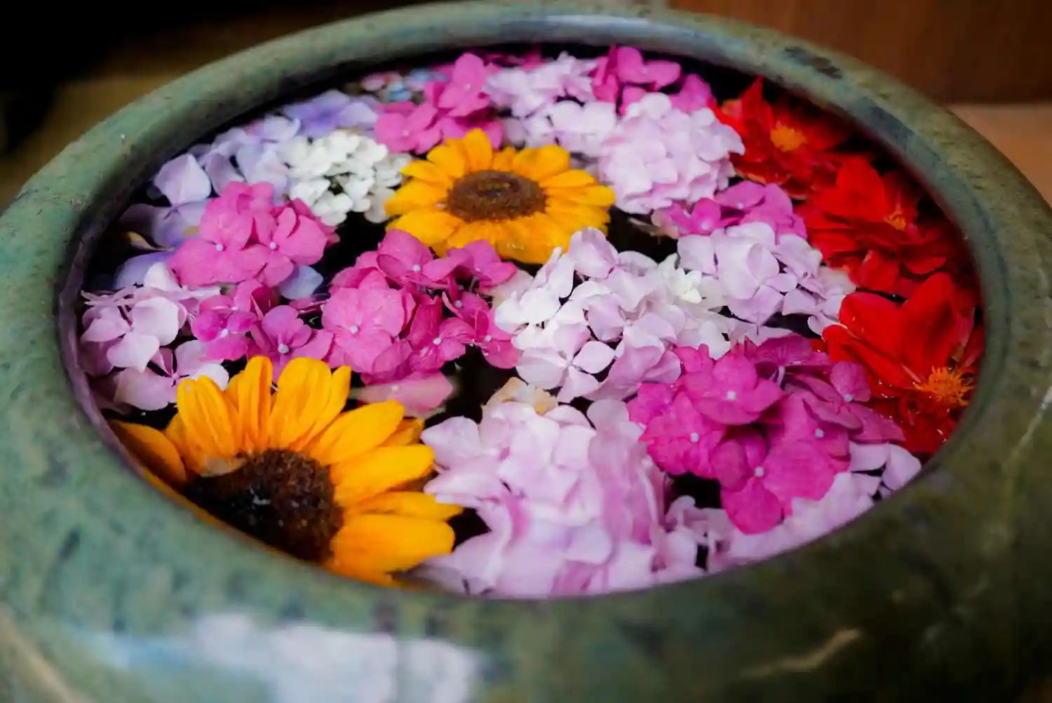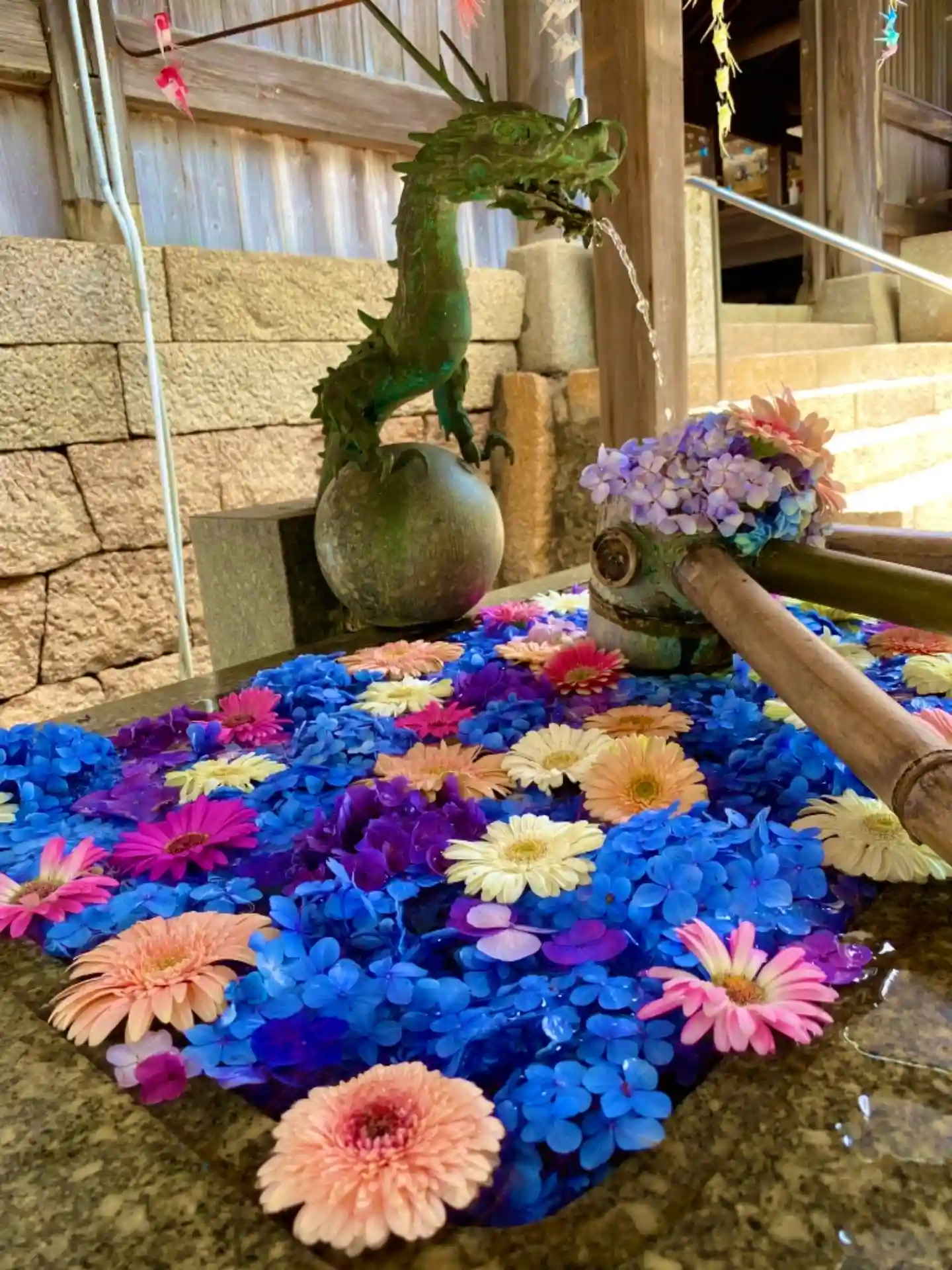 手水舎にお花が、浮かべてあり、い…