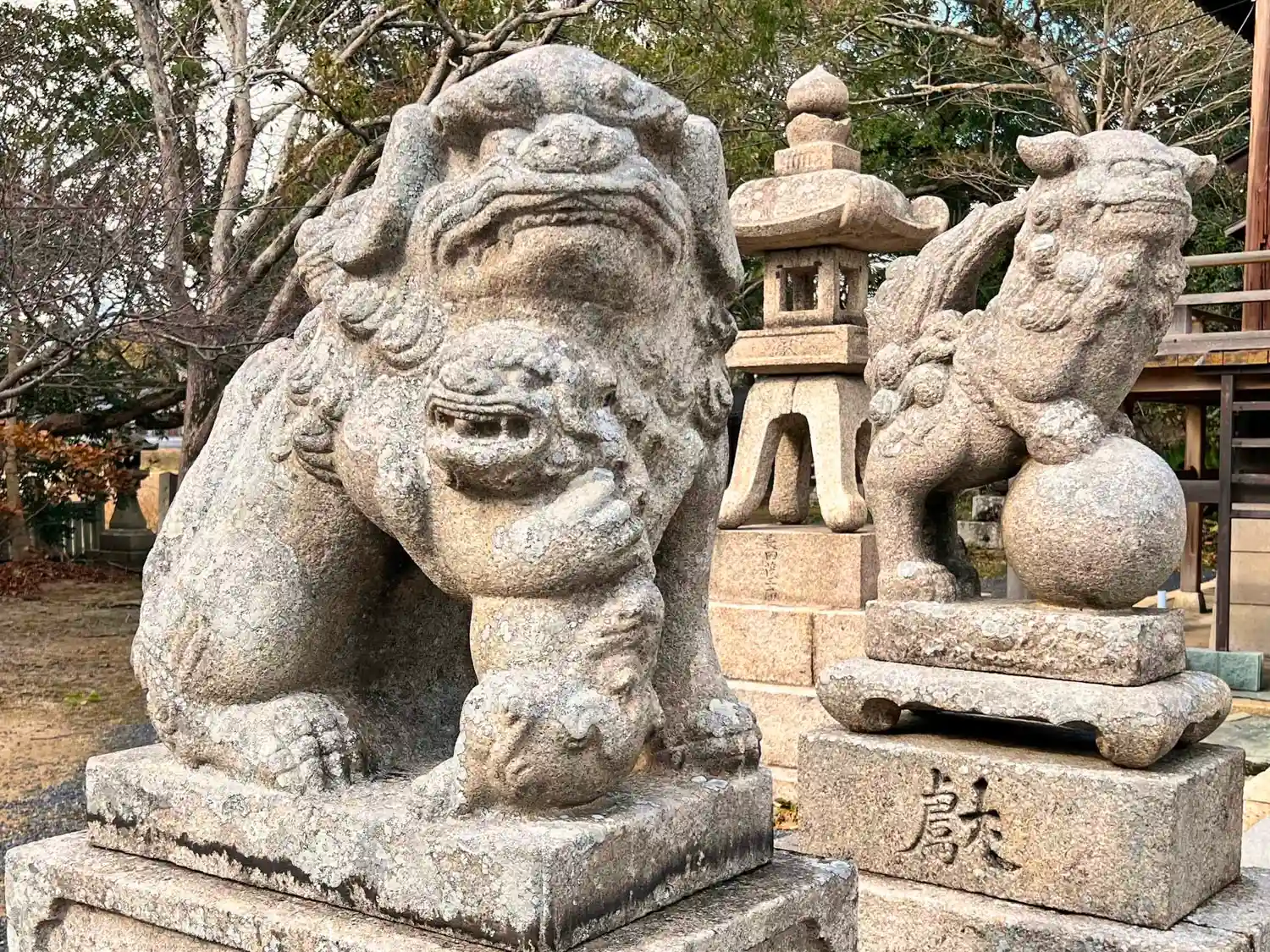 拝殿前右側の<狛犬たち>。<玉咥え>と<阿形玉乗り>。