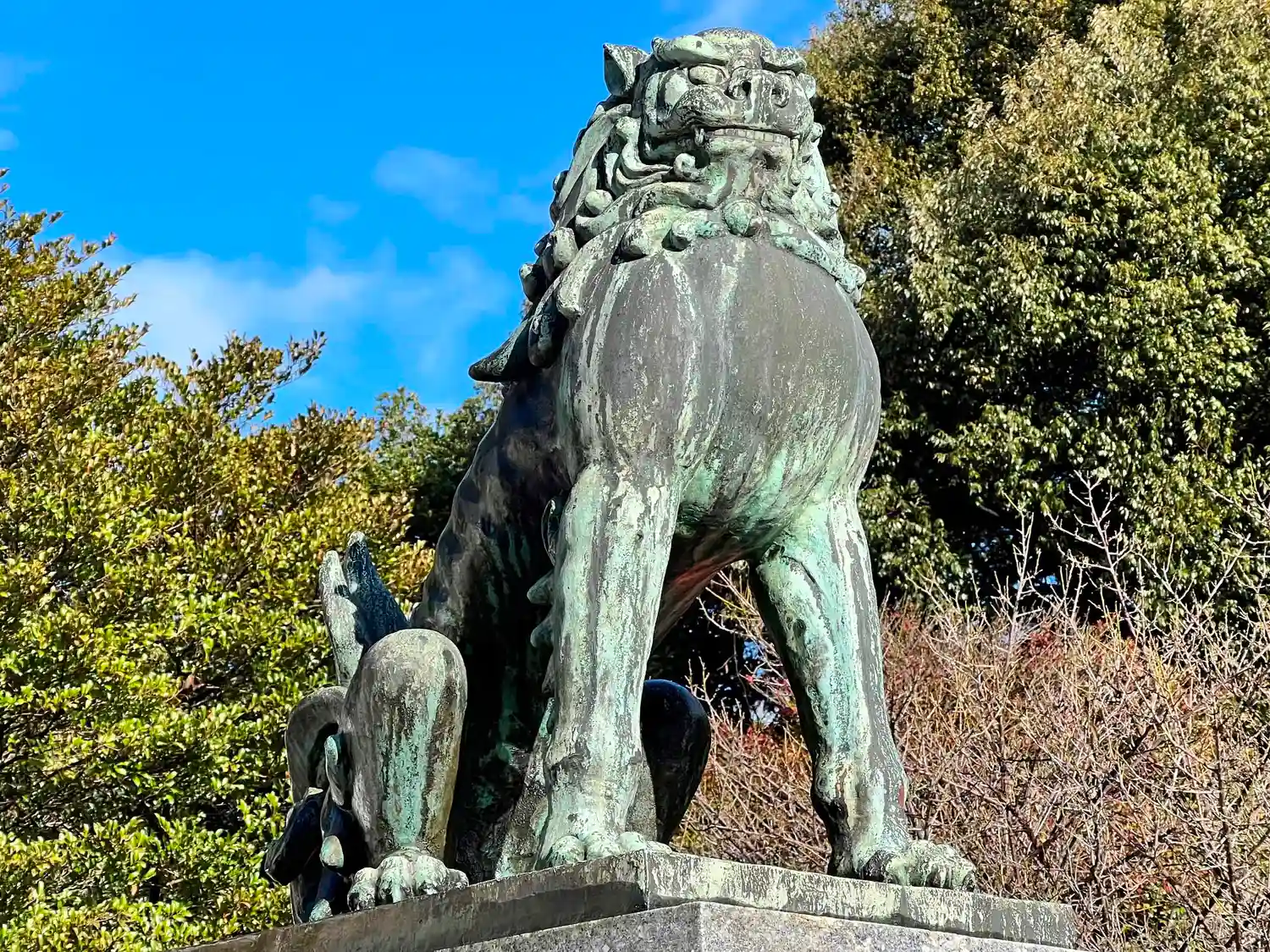 拝殿前左側の<狛犬>。大社や護国神社でよく見る、青銅製超マッチョ型の大きな狛犬。