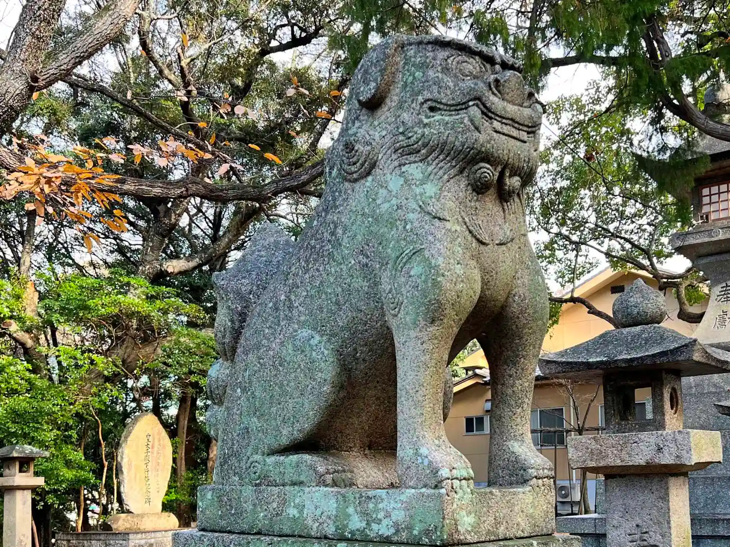 二の鳥居の後ろ左側にある<狛犬>。四角い顔の趣のある表情。
