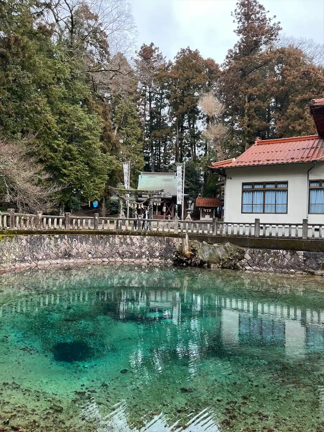 日本名水百選に選ばれた遊水・別府弁天池のほとりに立つ。なぜこの色になるのか理由の解明されていないと…