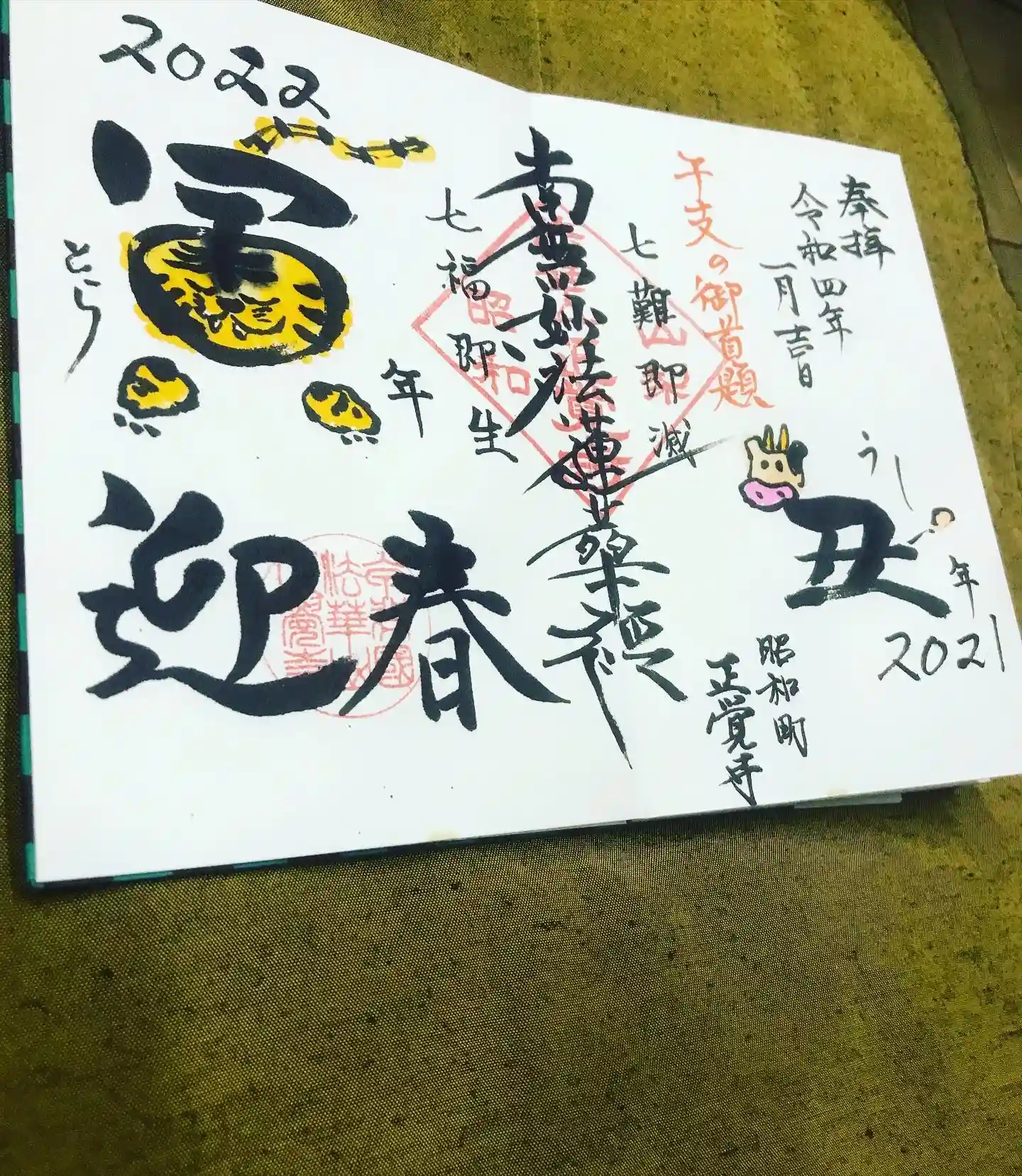 今回の御朱印は昨年読売新聞さまに掲載された「子から丑へ」から新年の「丑から寅へ」と、恒例の干支シリーズとなっております。