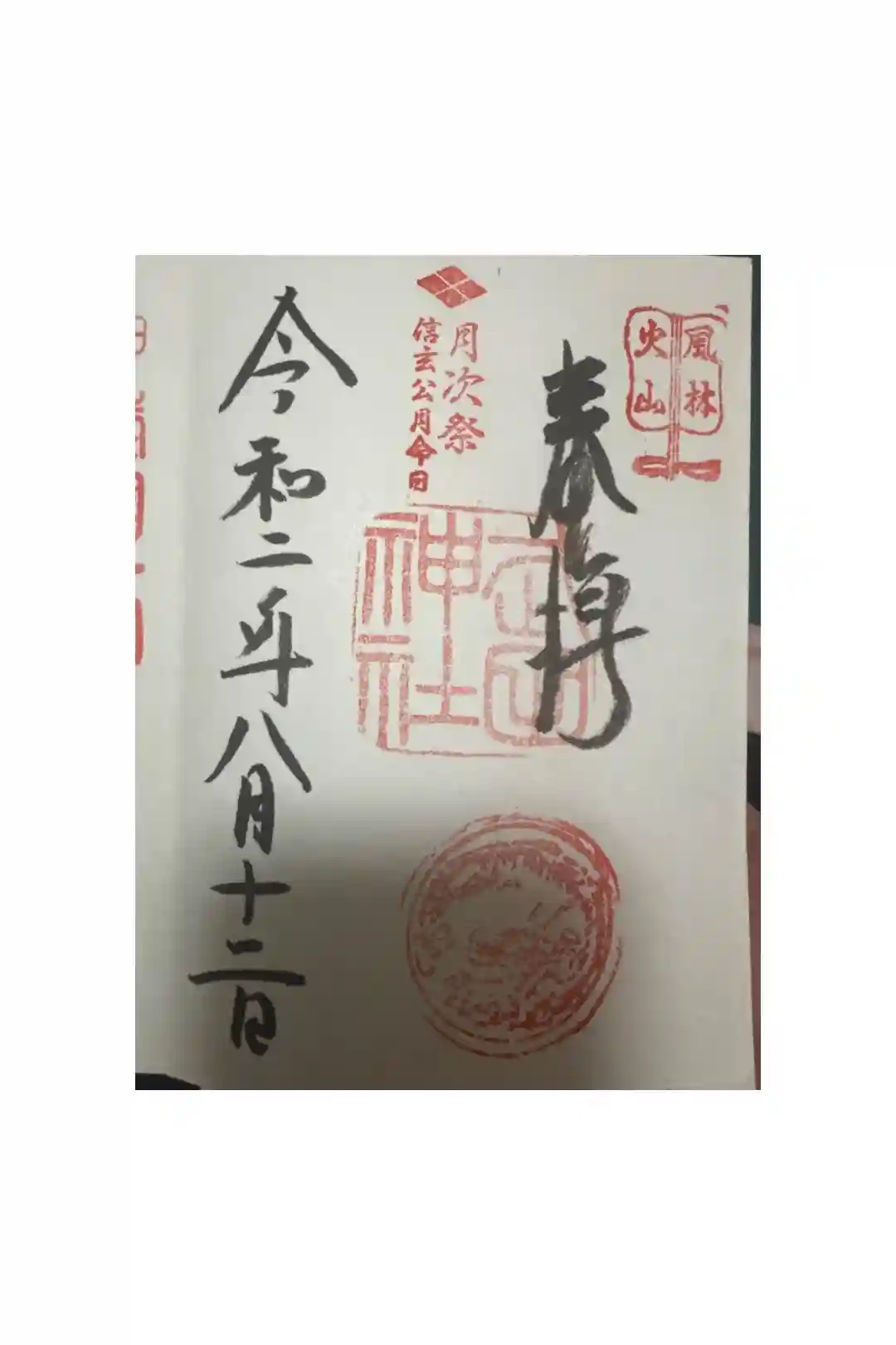 右上に風林火山と書かれた軍配の印、真ん中に社印、下に龍の印が押された御朱印です。
