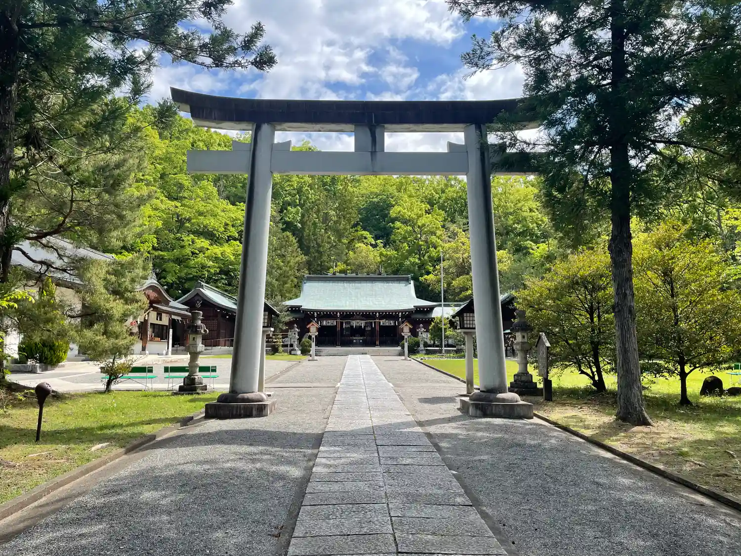 鳥居をくぐったところ。社殿前は広々としていて、真っ直ぐに伸びる参道が気持ちが良い。