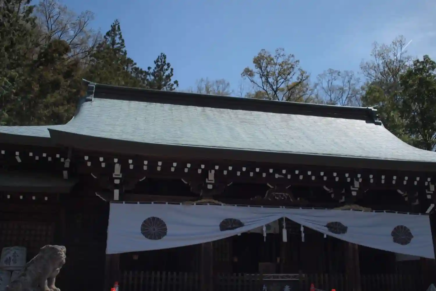 <拝殿>全景。左右に長く堂々たる風貌。方角としては、拝殿は西南西を向いている。