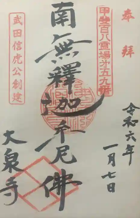 甲府市の相川扇状地に聳える、大笠山の西麓部に建つ曹洞宗の寺院です。1521年に、武田信虎が天桂禅長を開山として建造しました。信虎自信は、1574年に信州で命を失い、その遺骸は国元の大泉寺に埋葬されました。御朱印は直書き。