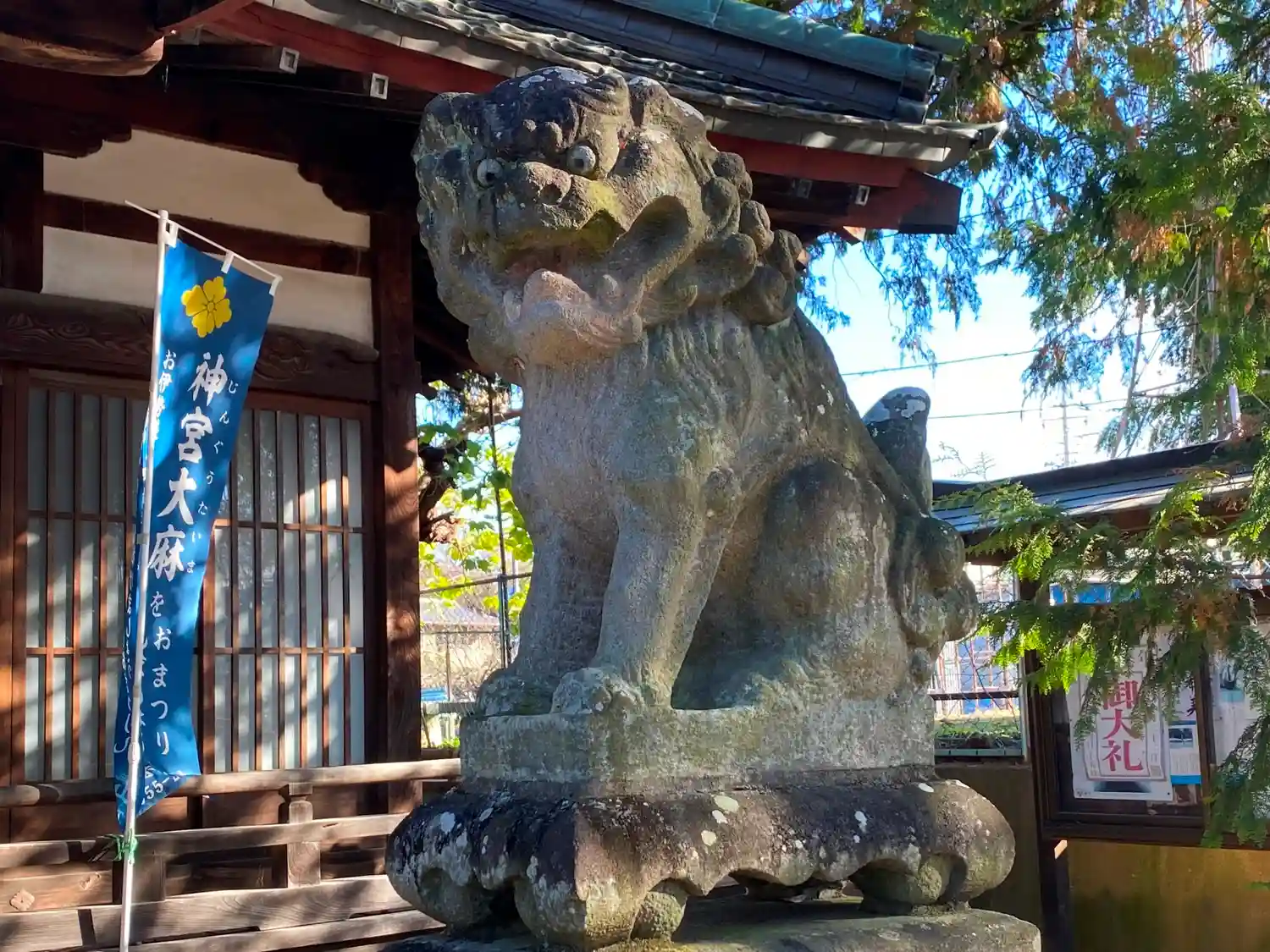 右側の<狛犬>。口を開くと怖いどころか、かわいらしく見える。