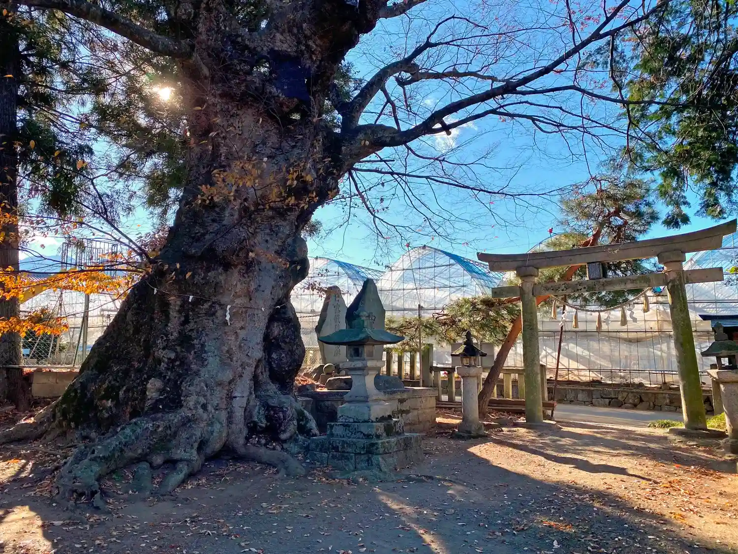 拝殿前から振り返り、入口鳥居の方向を望む。鳥居の南側はビニールハウス。