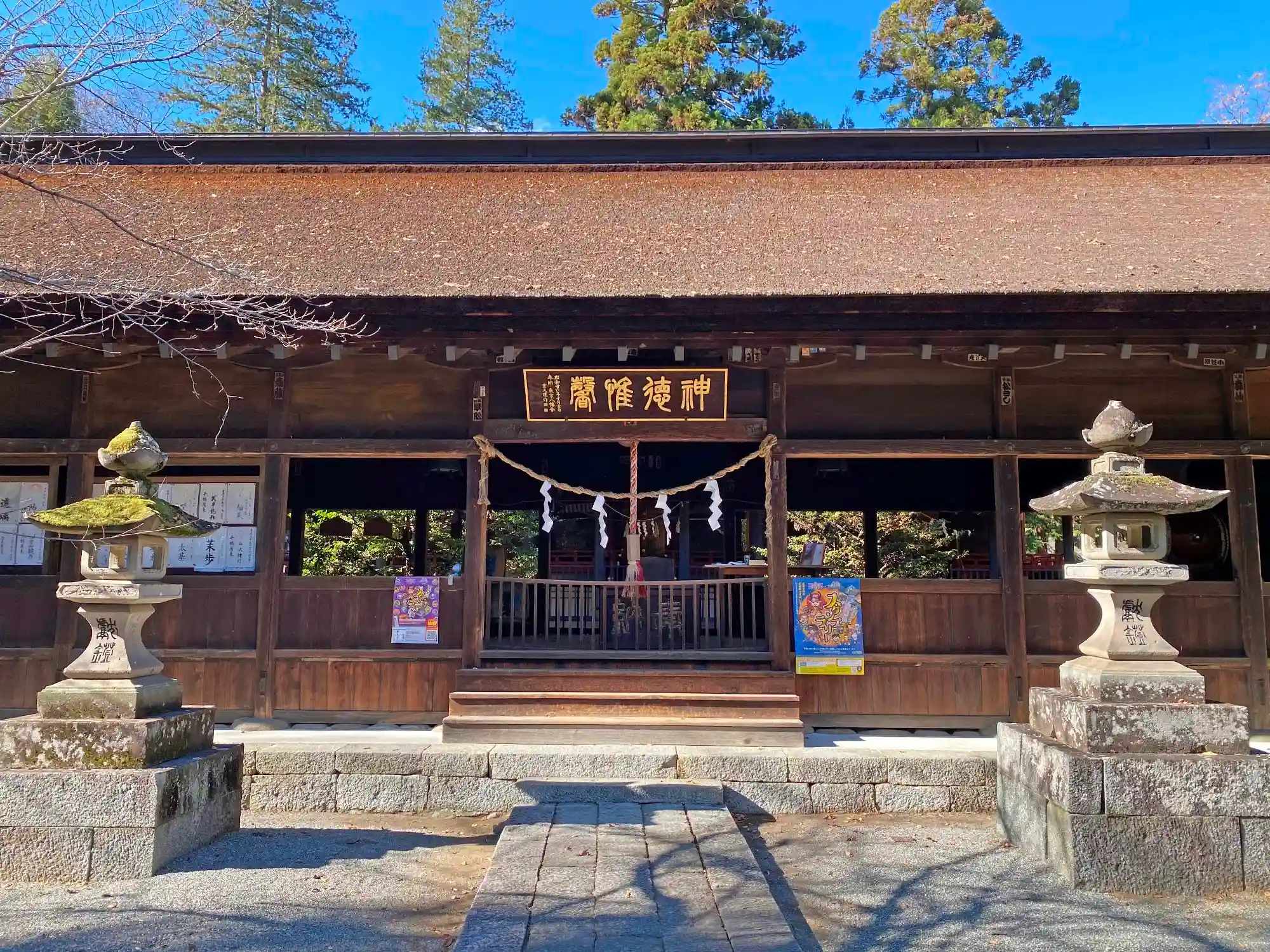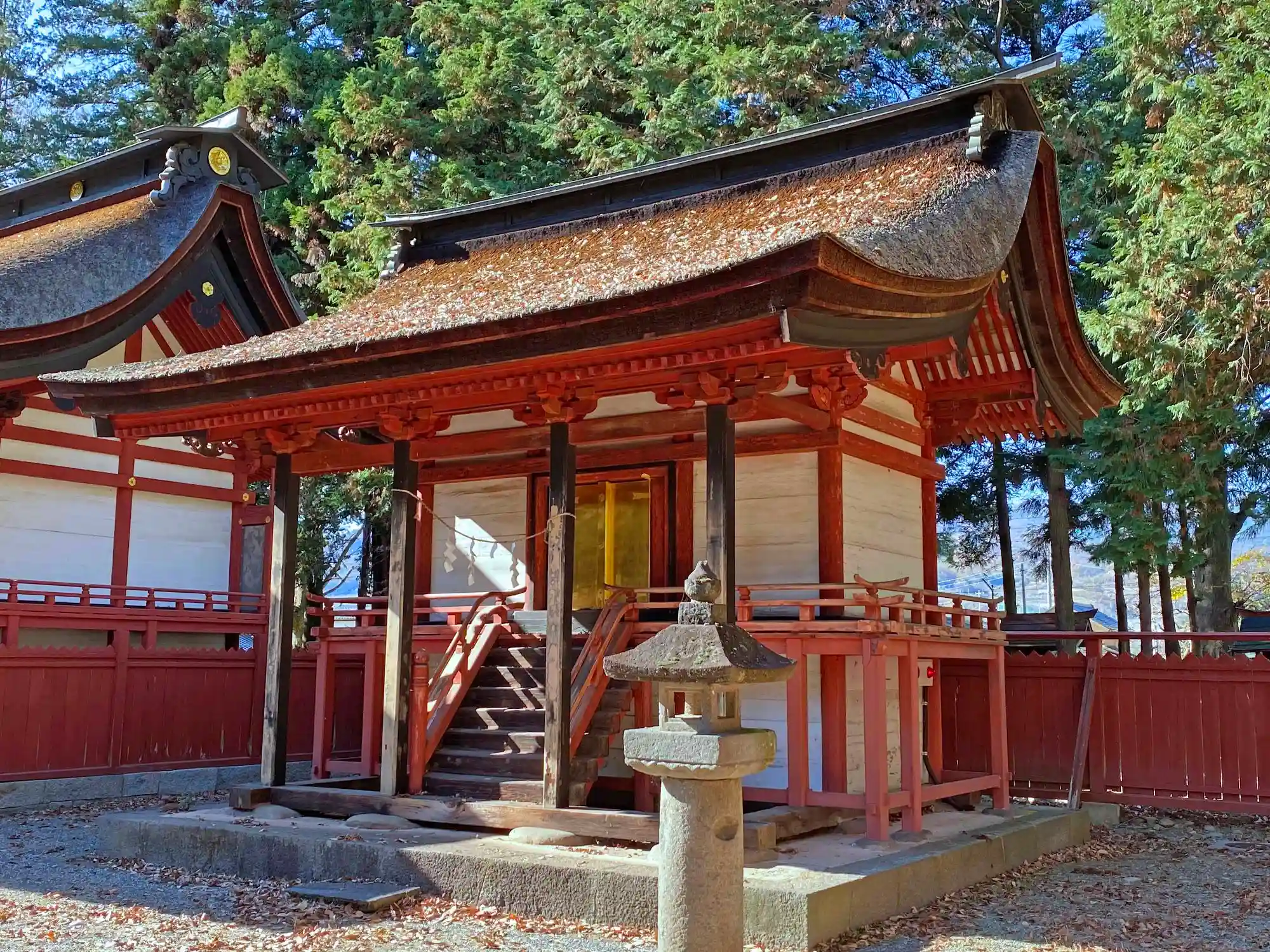 階段を登ったところから<拝殿>を望む。1553年に武田信玄が信州村上義清攻略の際に祈願成就のために造替と記録がある。桁行11間、梁間3間、一重切妻造、檜皮葺。左右対称ではなく、床が低いなど神社拝殿としては特異な点がある。国指定の重要文化財。