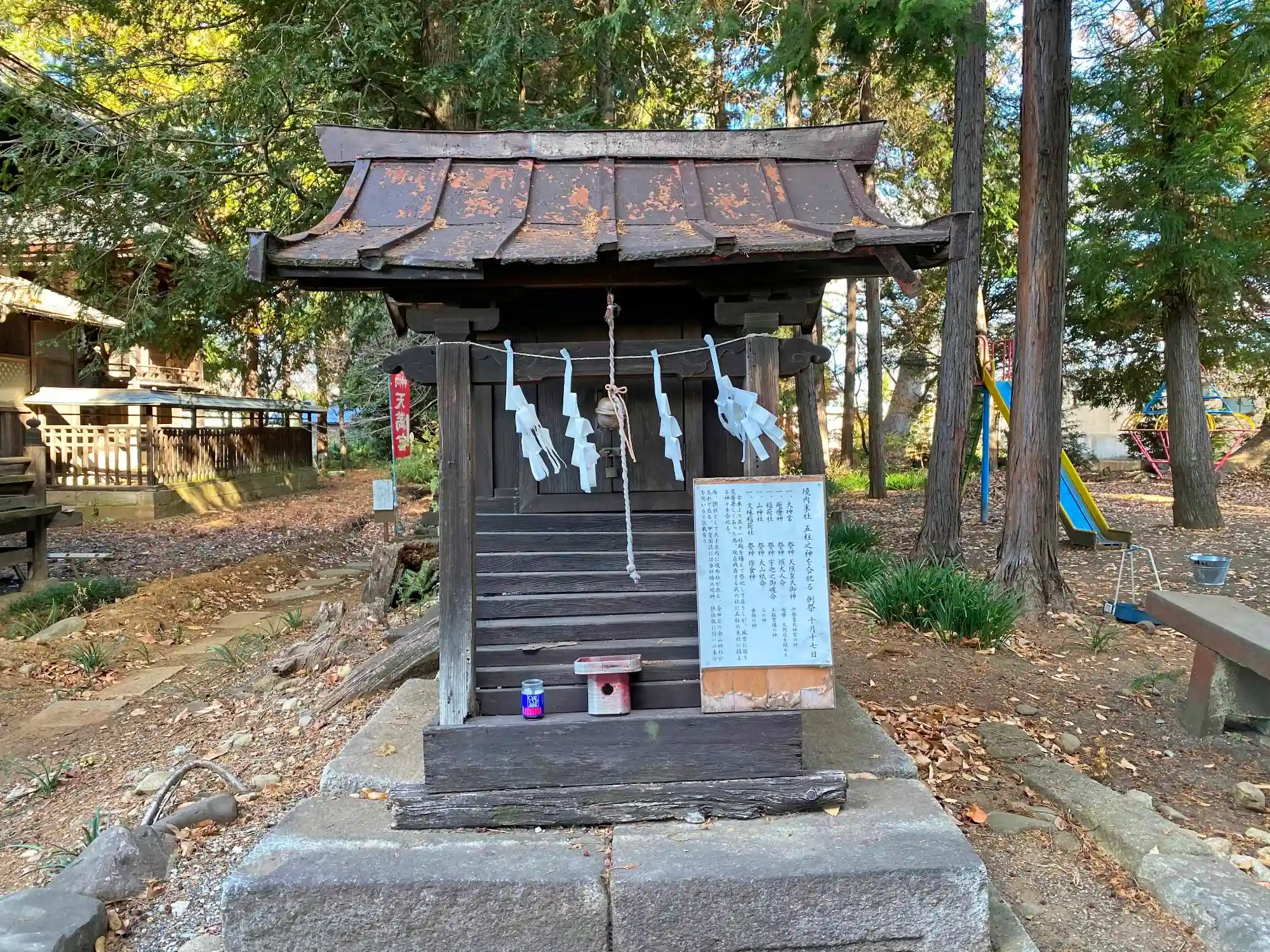 社殿の右手の林は児童公園にもなっている。写真左側には<祖霊社>の石製小祠。