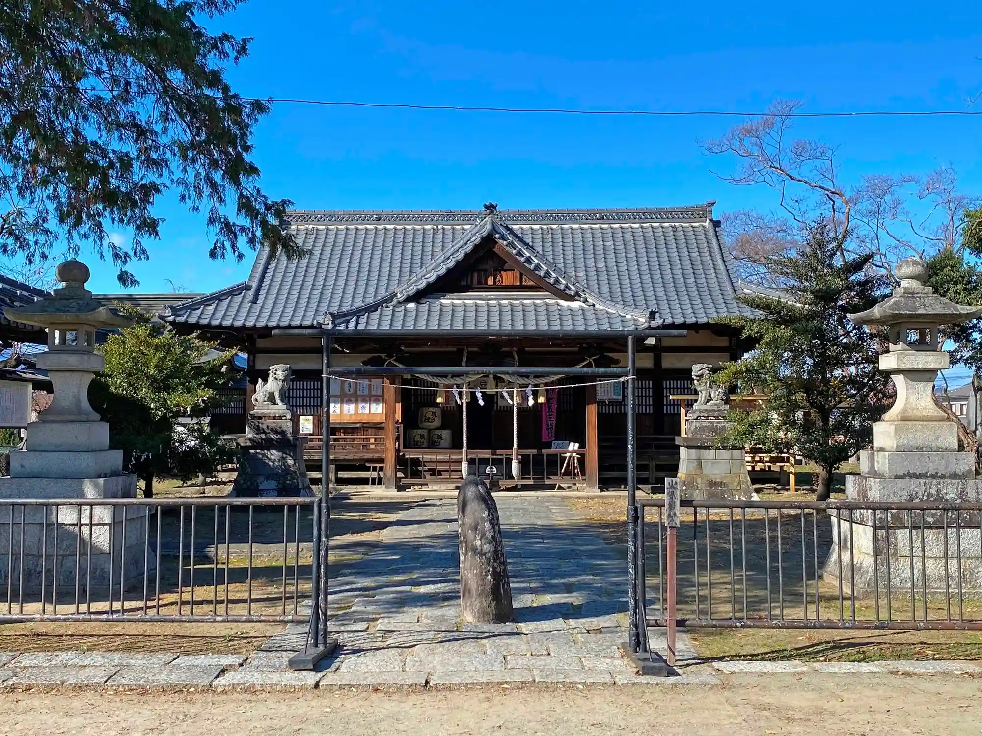 神域入口から社殿を望む。神域は、石製の瑞垣ではなく、黒い鉄柵で区切られている。