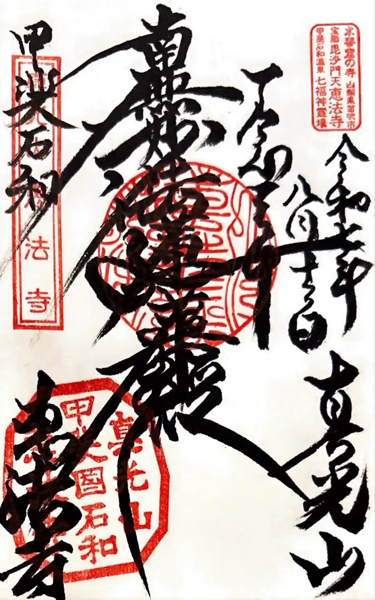 | ご由緒 | 室町時代の永正年間(1504年-1521年)に恵月院日真尼が創建した薬師堂が起源。天文年間(1532~1555年)に身延山より七面天女を勧請し祀る。永禄11年(1568年)信立寺塔中定泉坊の日宝を開山に迎え、恵月院日真尼を2世として寺号を真光山恵法寺とする。元亀元年(1570年)10月に七面堂を建立した。安永5年(1776年)石和代官久保平三郎勝峰が五女の久竟院殿の供養のため本堂、庫裡、客殿を建立した。明治40年(1907年)子酉川(現在の笛吹川)が氾濫する大水害で、庫裡、客殿、鎮守七面堂、願満稲荷社、総門、山門などの諸堂と、境内を囲む白塀を流出し、本堂1棟のみを残すという被害を受けた。戦後になり復興され現在の姿が整備された。 |