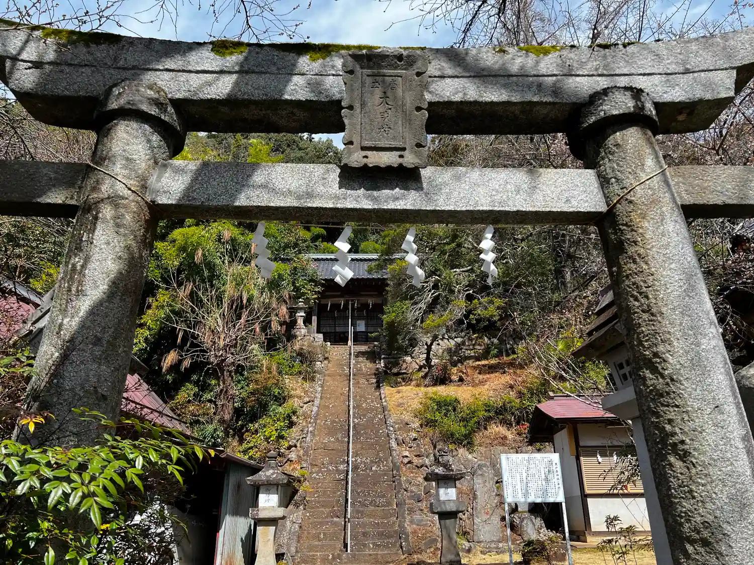 階段を少し上がったところにある<鳥居>と<社号標>。