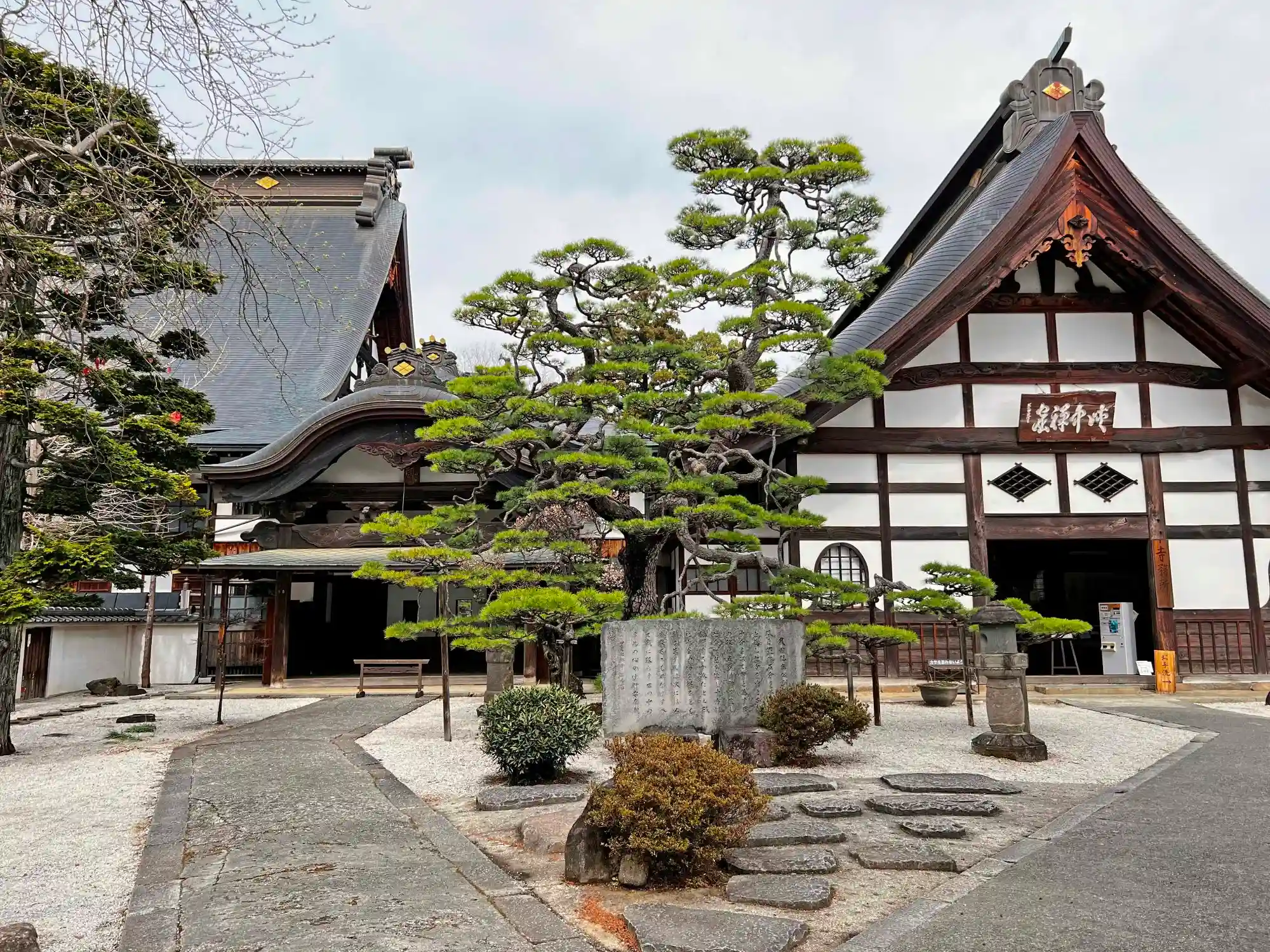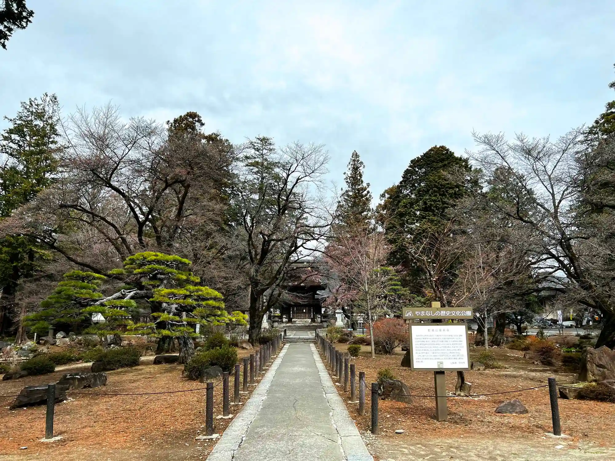 当寺は、JR中央本線・塩山駅の北北西3kmほどの平地にある。山梨県の観光名所の一つなので、周囲には観光客向けの飲食店が立ち並び、観光バスが集まるバス停もある。境内は広々としていて、立ち並ぶ伽藍も趣があり、古木も多く立っている。有料拝観の見どころは武田信玄を祀ったエリア。伽藍裏手(北側)の国の名勝にもなっている庭園は、枝垂れ桜の巨木が中心のようで、参拝時はまったく花がなく、少し寂しい感じだった(落葉樹が多いようで、冬以外の季節が良いのかも)。
