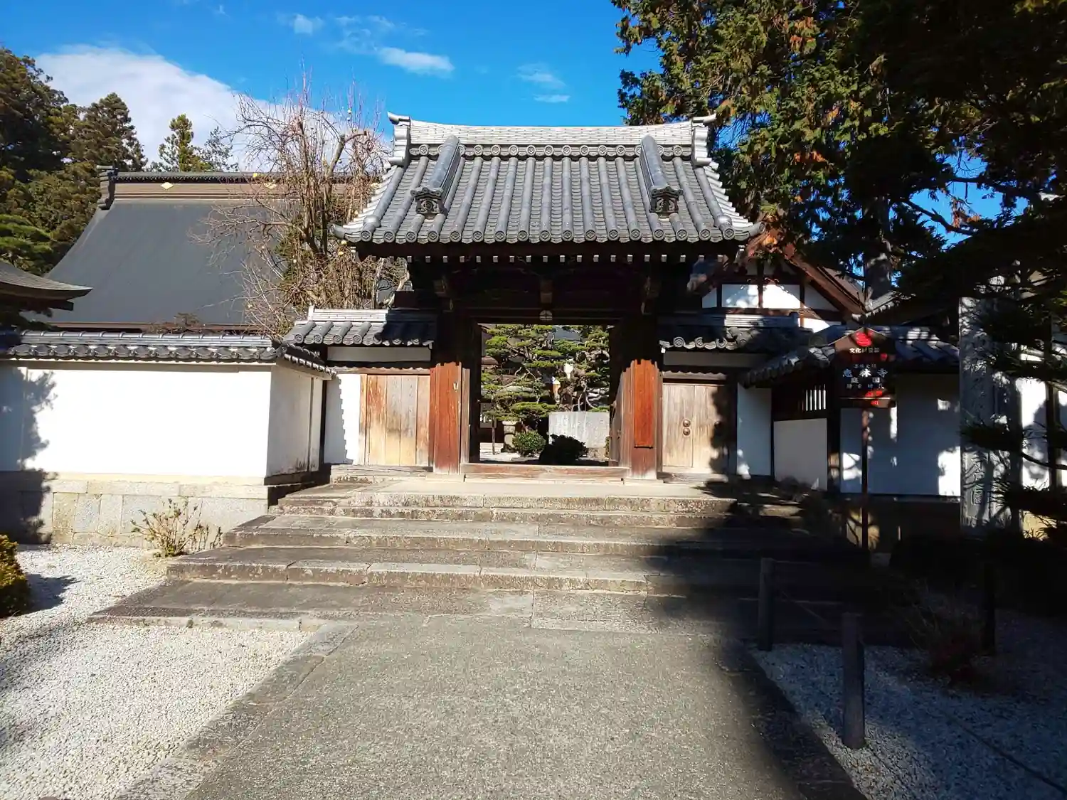 斜めから<四脚門>。扁額には「乾徳山」の文字。