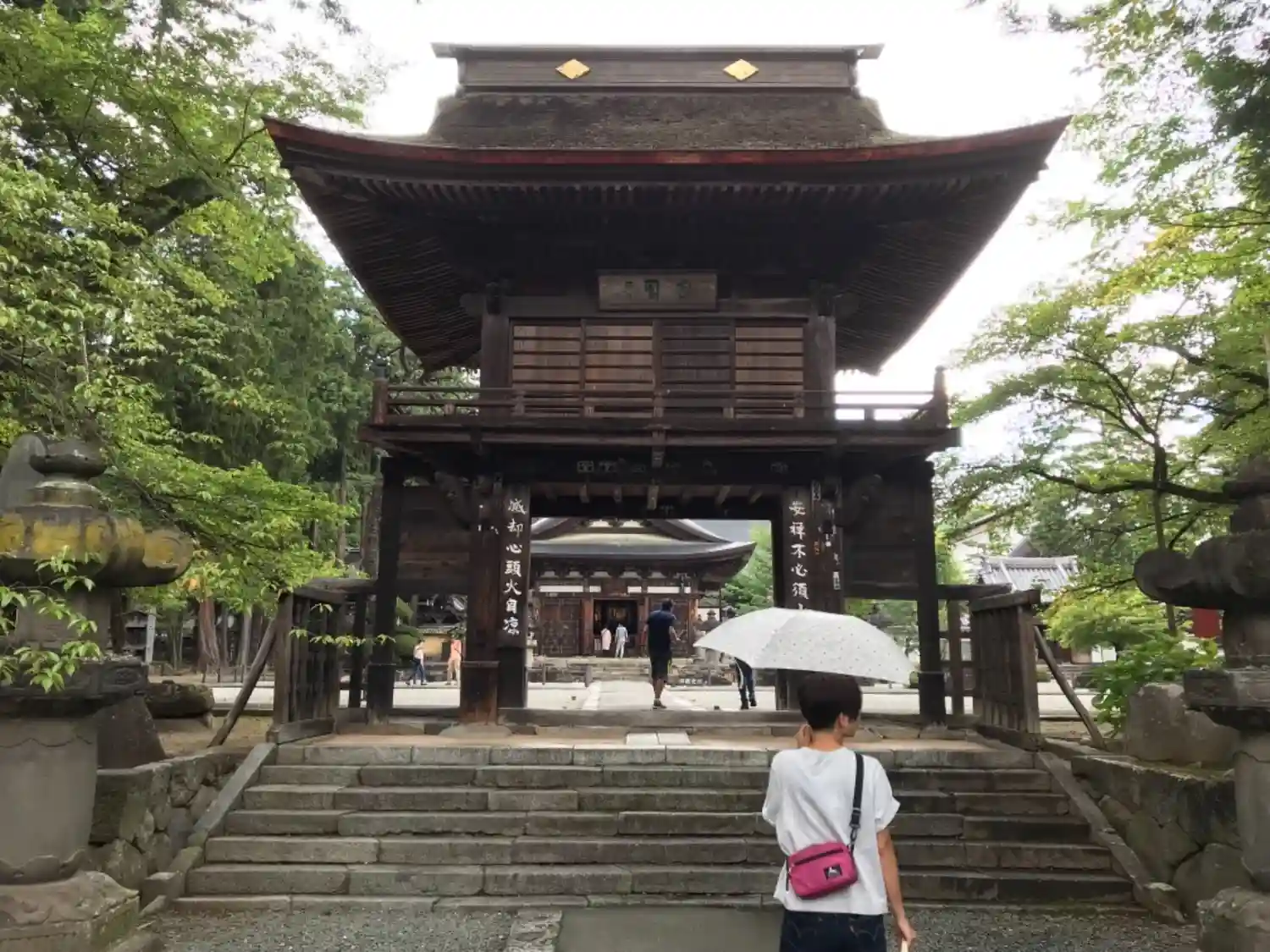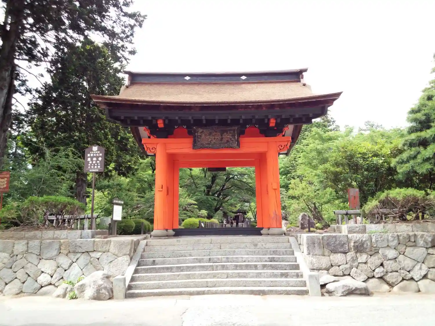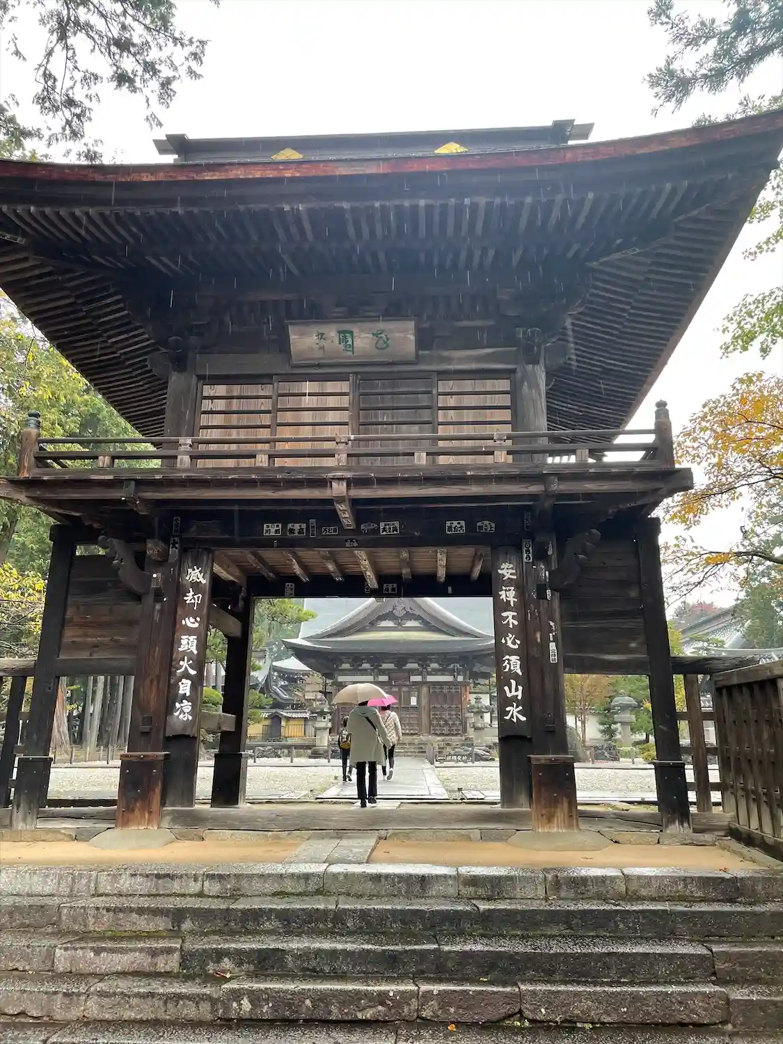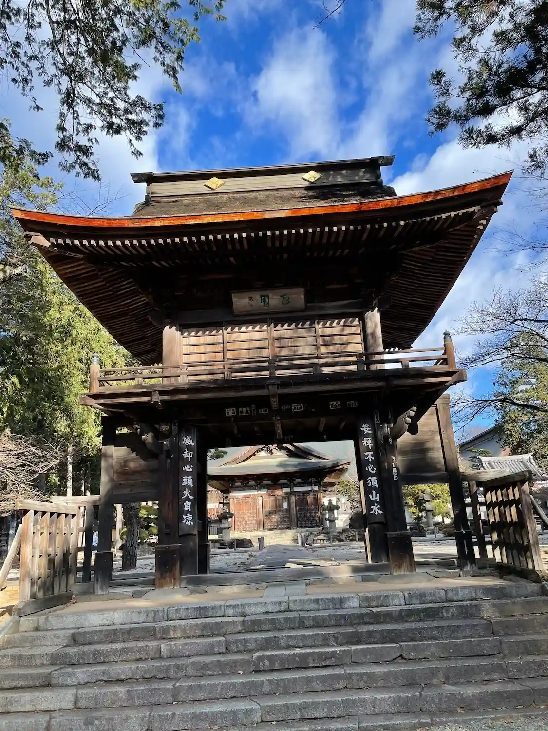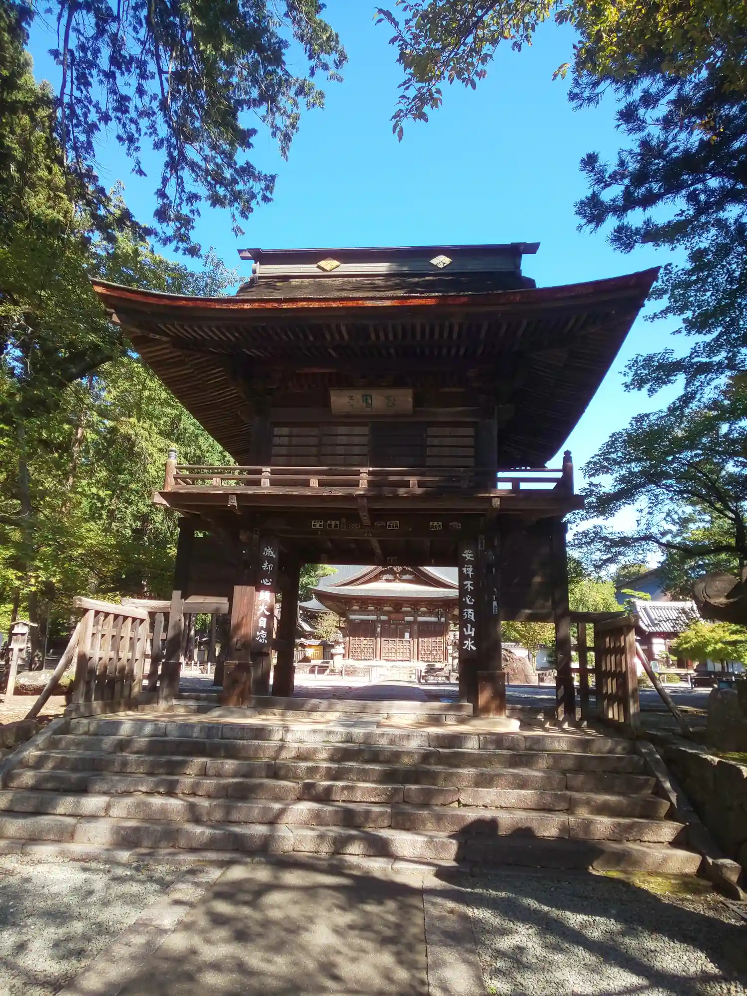 参道正面に現れる<三門>。織田信長の焼き討ちで壮絶な火定を遂げた快川和尚の遺偈が掲げられている。