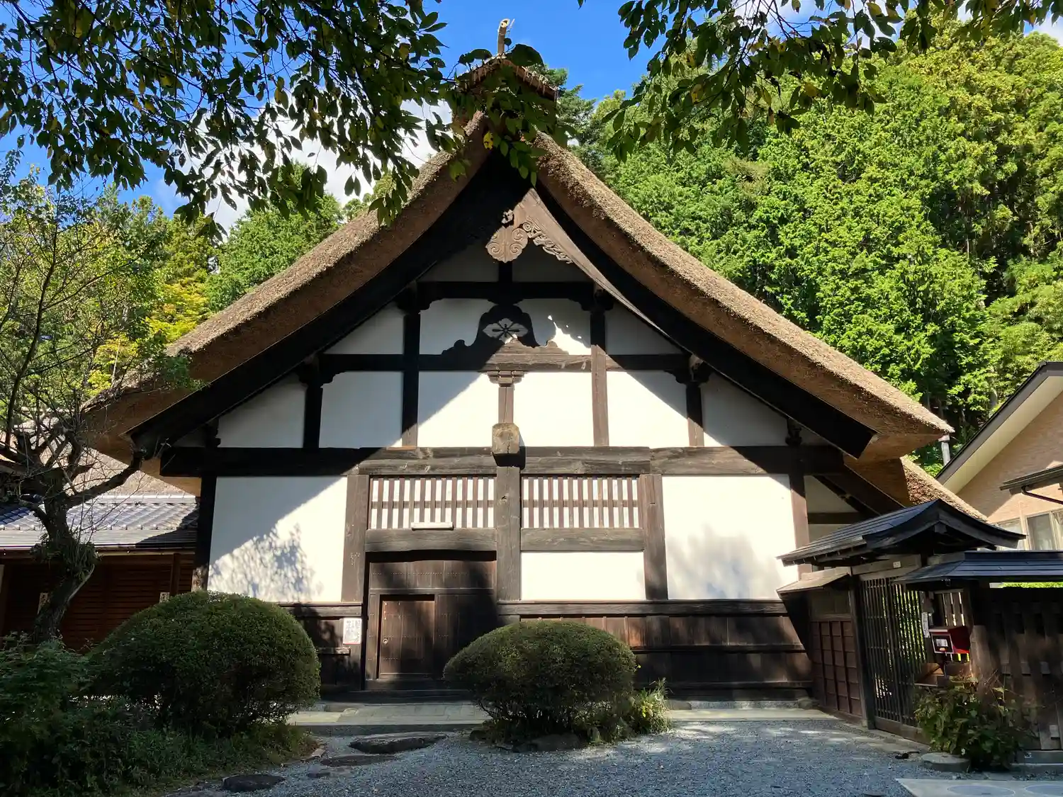 本堂の右側にある<庫裏>。江戸時代前期の建立で、桁行十間、梁間五間、東側面庇付、一重切妻造、妻入、庇葺きおろし、茅葺。国指定の重要文化財。