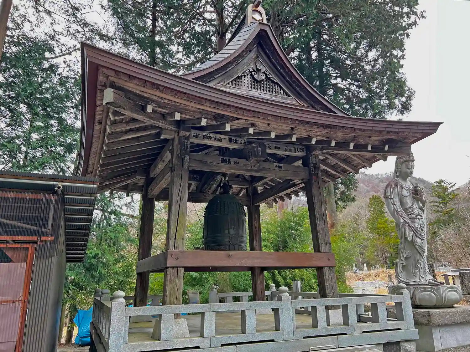 本堂に向かって左側にある<鐘楼堂>。右側には観音像が立っている。