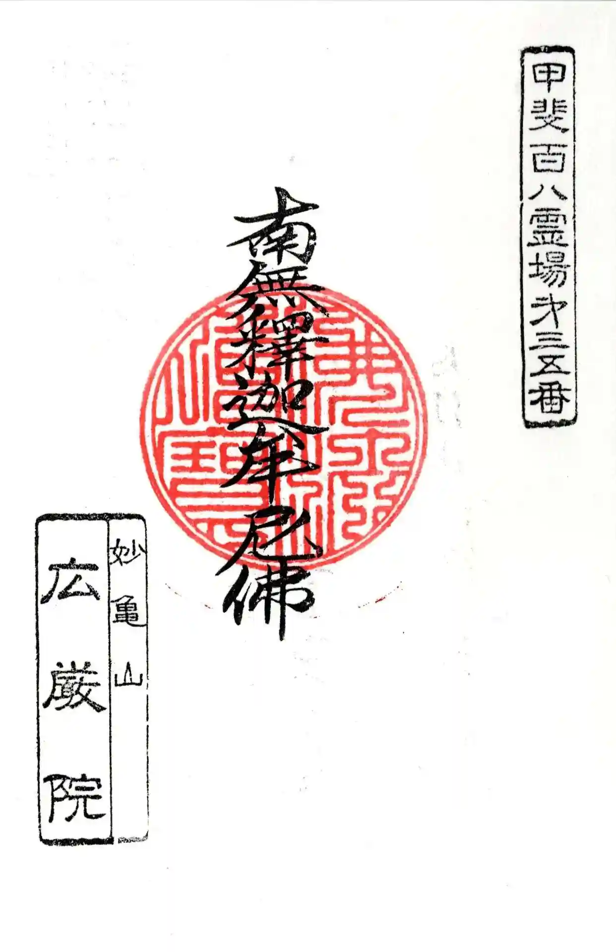 拝受した御朱印には、中央に「南無釈迦牟尼佛」の尊名が端正な筆致で記され、右上の「甲斐百八霊場 第三十五番」の印が、古くからの信仰の拠点であることを物語っています。左下の「妙亀山 廣厳院」の墨書きとともに、奥様の優しい語り口と桃の花の香りがよみがえる、特別な一枚となりました。