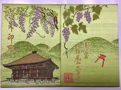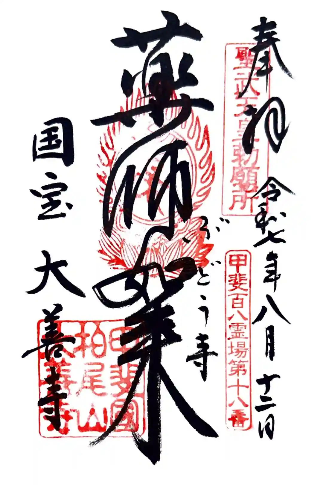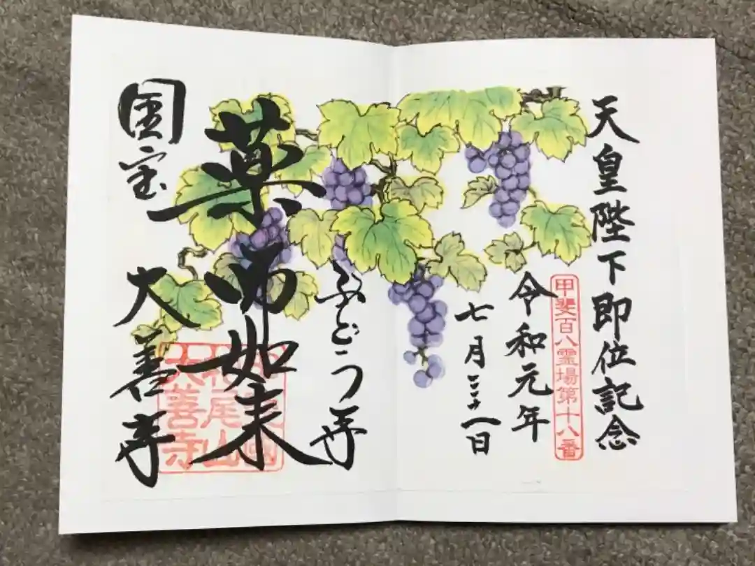 真ん中に薬師如来その右にぶどう寺、左に国宝大善寺と書かれ、右上に聖武天皇勅願所の印、右下に甲斐百八霊場第十八番の印、真ん中に梵字の印、左下に甲斐國柏尾山大善寺の印が押されています。