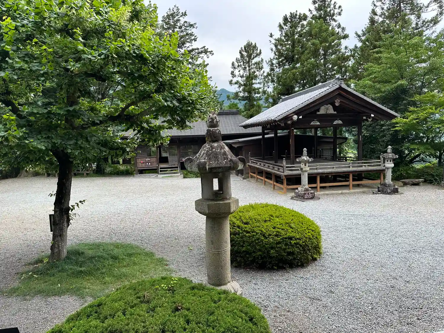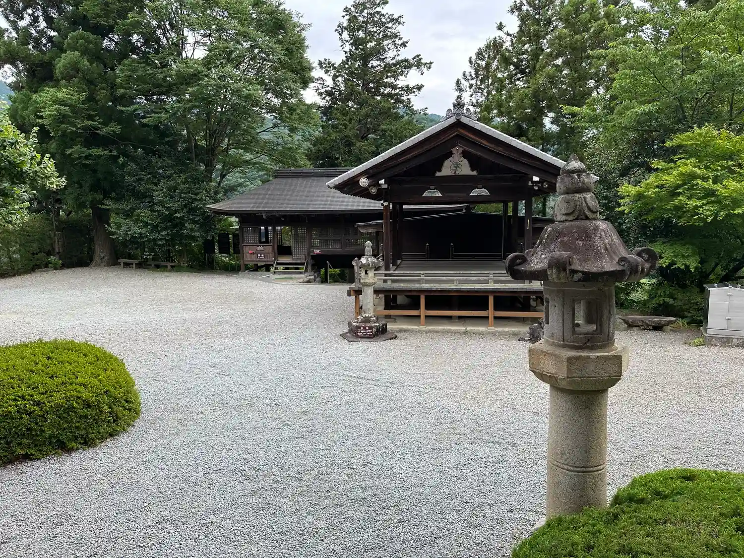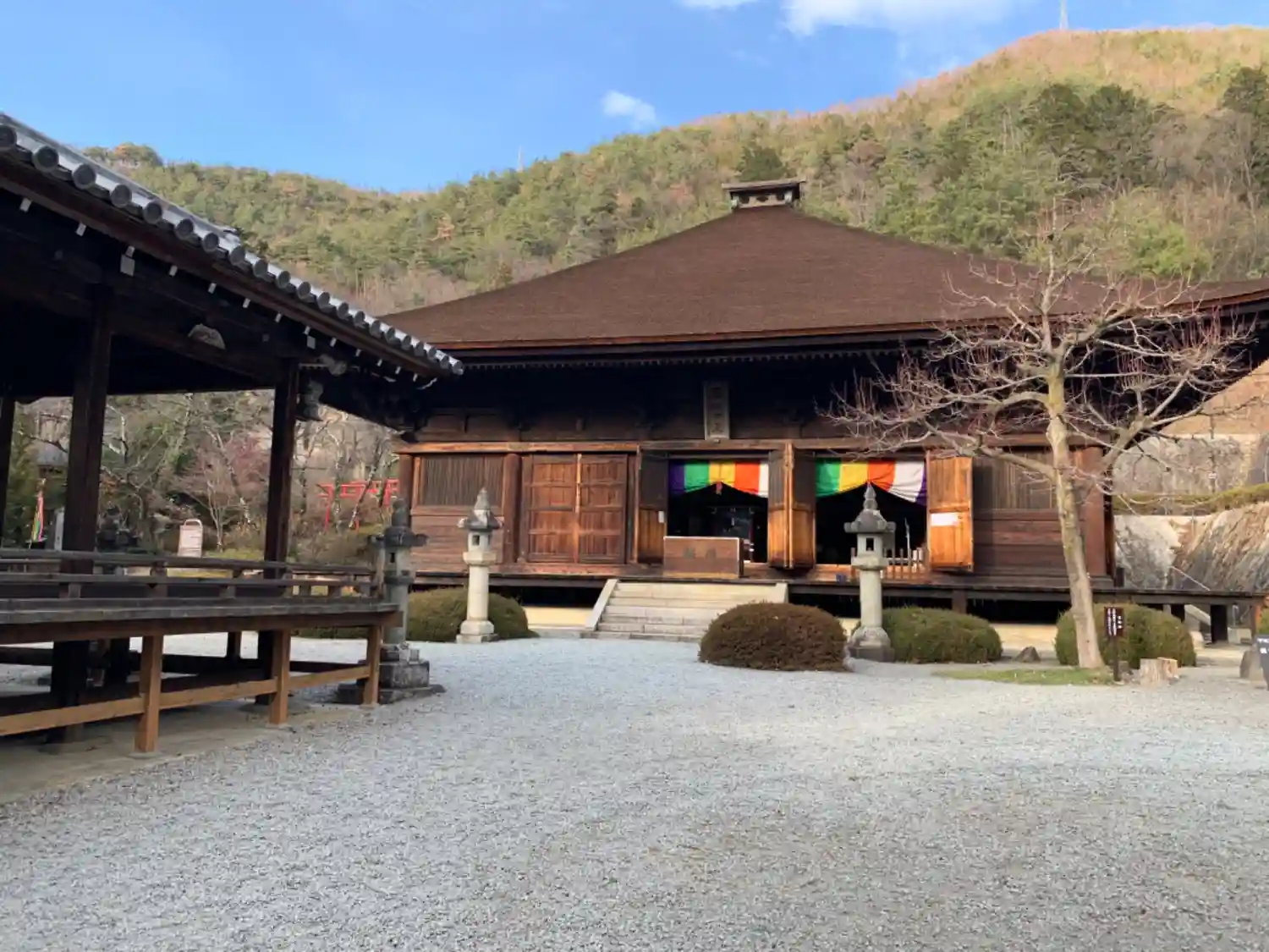 本堂近くから境内を眺める。左の建物が階段を上がって来た時にくぐった<楽屋堂>、右の建物が<稚児堂>。