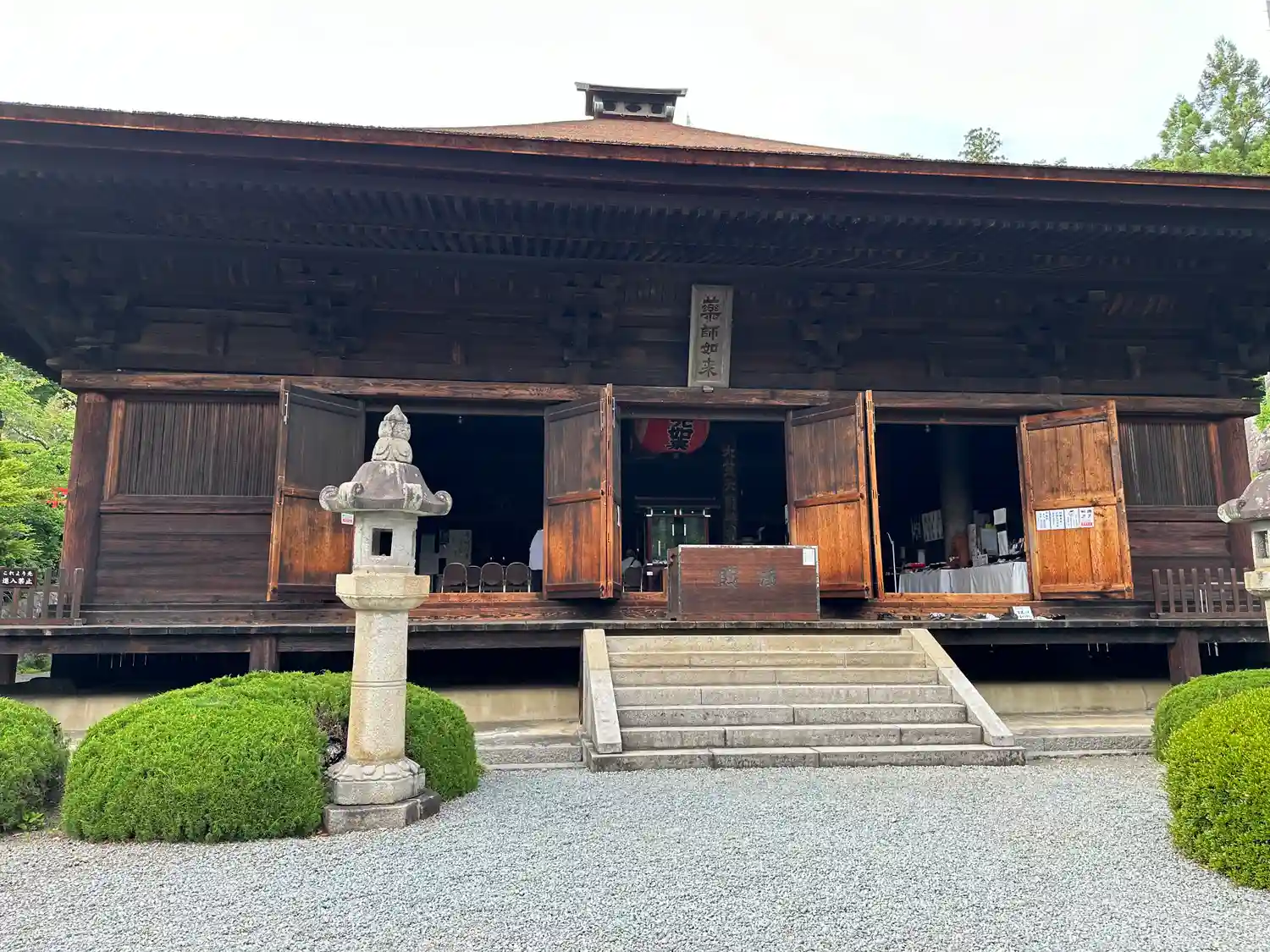 <本堂>入口。扁額には<薬師如来>の文字。