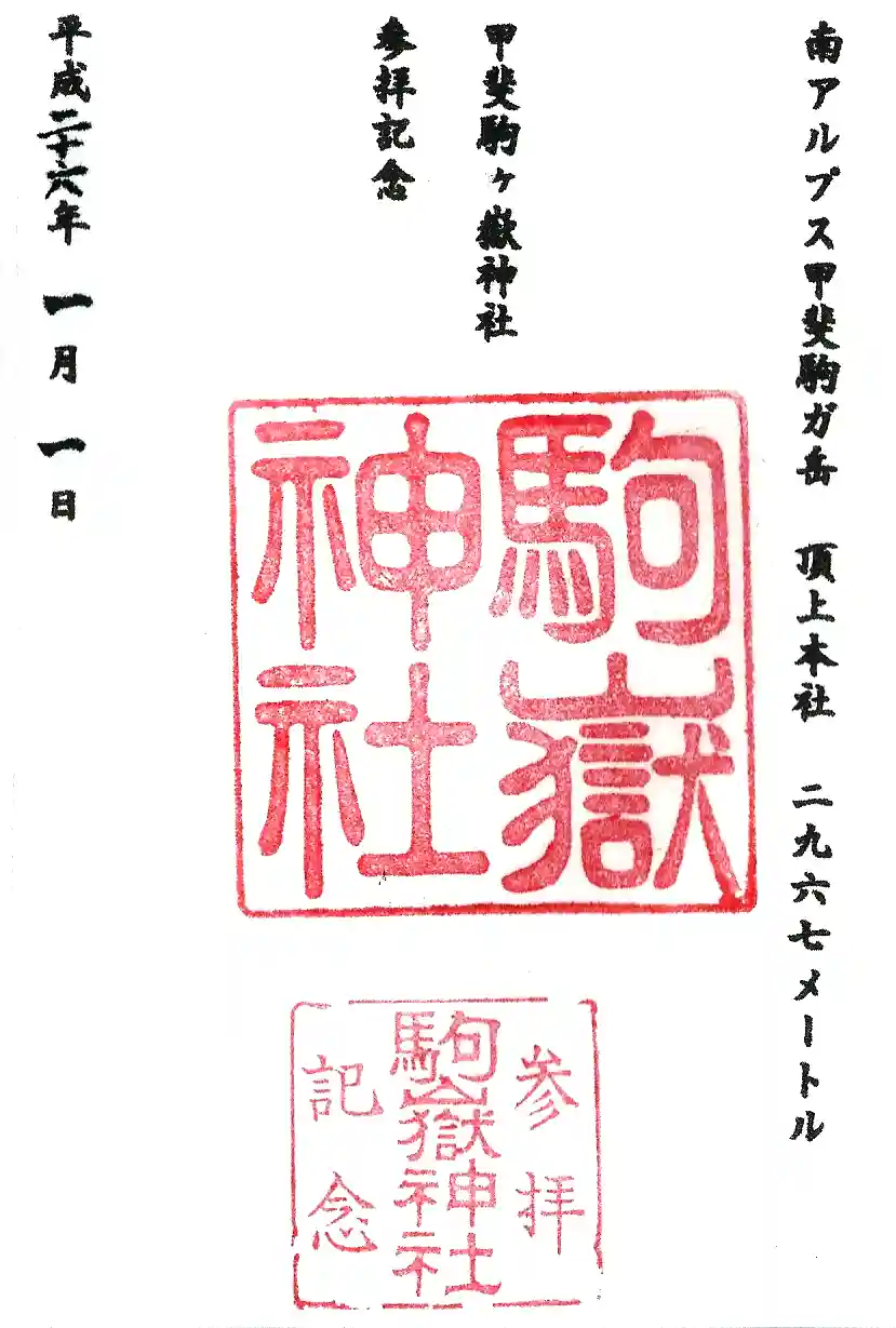 神の代に建御名方命この地に至りし時、雄大にして崇高な山の姿にうたれ、「この山はいと高く清々しき地なり。かれここにあが御親の神を祭るべし」と云うに始まる。雄略天皇の御代年六月に改めて雲州宇迦山(出雲大社)より遷祀したと伝えられている。 祭神は国家鎮護、五穀守護の神大己貴命(大国主命)にして造化の神天之御中主神、高皇産霊神、少彦名命、素盞鳴命、保食之神等の諸神を合祀している。駒ケ嶽は甲信に誇る高山でであり、懸崖数千丈の絶壁にして、上古より神仙の集る霊山として知られ白鳳二年役の行者小角が当山にて仙術を修め、富士山とともに当山の開闢とも伝えられている。往古新羅三郎義光はこの神に祈願して子を授かり、その子孫が武運に勝れ繁栄するよう、山頂の巨石に延久主義光の五字がかすかに残っていたと社伝に伝えられている。釜無川等四川が駒ケ嶽に源を発し、その下流一体には牧場があり馬の産地であった当山の源流には神馬の精が宿っているといわれ、この水により育った馬の中から多くの名馬がうまれたと云われる。厩戸皇子の御愛馬はこの渓流によった神馬と云われ、郡名も本山により巨摩郡と称すと云う。また広大な山中には珠玉、薬草を産し、沢山の人がその恩恵に浴している。牧場からの貢馬は神前にて安全を祈願し、山中から採集された薬と共に朝廷に献上され、大同年間畏こくも天皇の病を癒し奉ったと伝えられている。文化十三年六月、信濃国の延命行者(小尾権三郎)は入山禁止の駒ケ嶽に特に許されて入山し、幾多の苦難を克服し、嶮岨なこの山に始めて登山の途を開かれた。世に駒ケ嶽開山として尊敬せられ神徳顕著により崇敬者の登山する者が多い。
