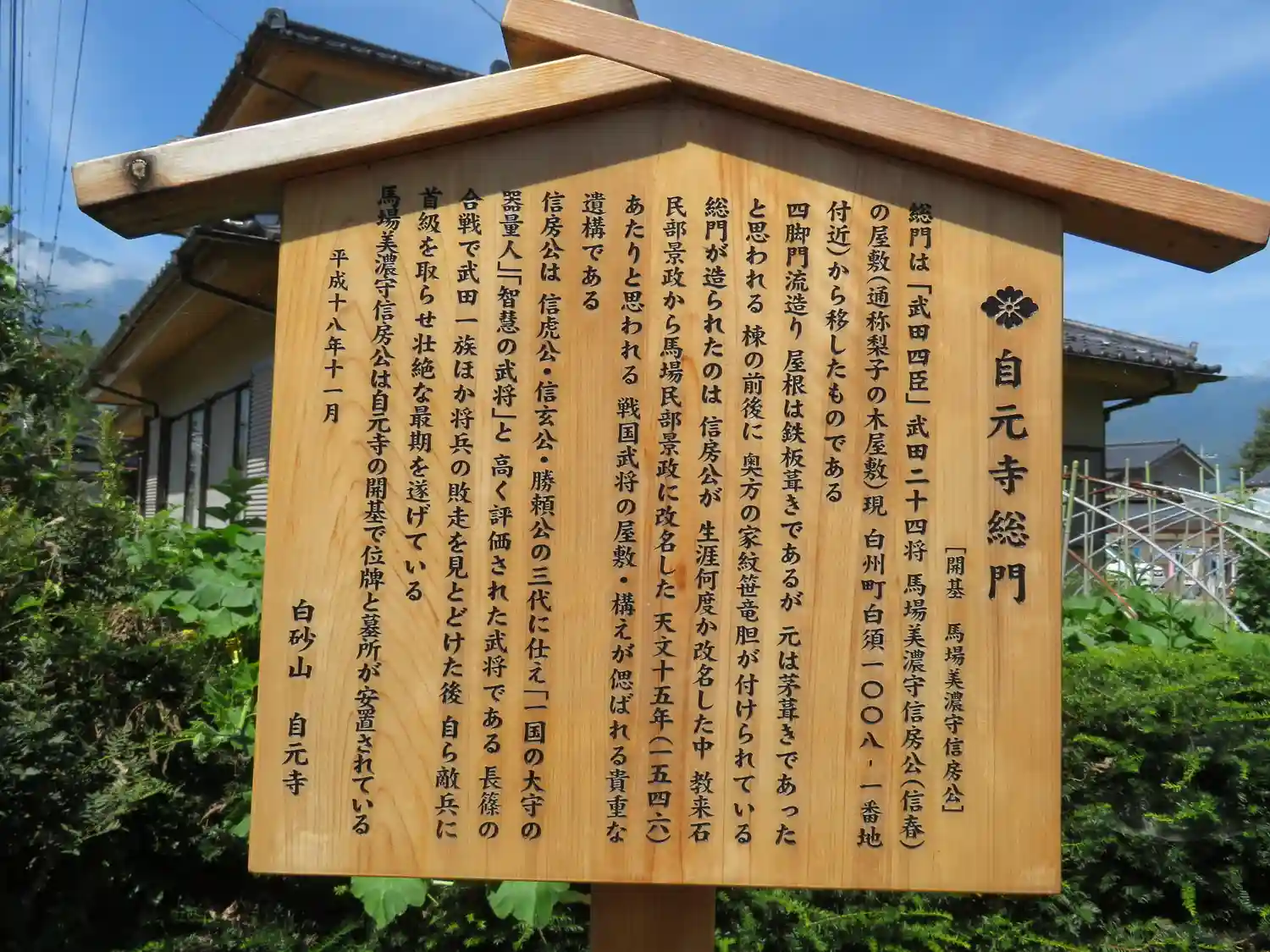 | ご由緒 | 武田四名臣・馬場美濃守信房公によって白須坊田に建立。江戸後期に焼失、現在地に再建。江戸時代は寺子屋、戦時中は疎開先としても活用され、馬場家・檀信徒はじめ地域の安寧を願い、共に歩んでいます。創建以前は山岳信仰の寺院(真言宗)で、更に山中にあったことが口伝と地名に残されています。 |