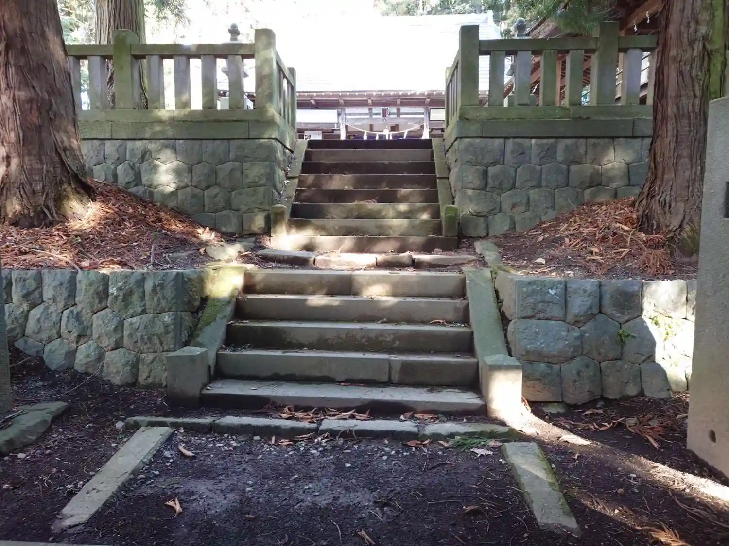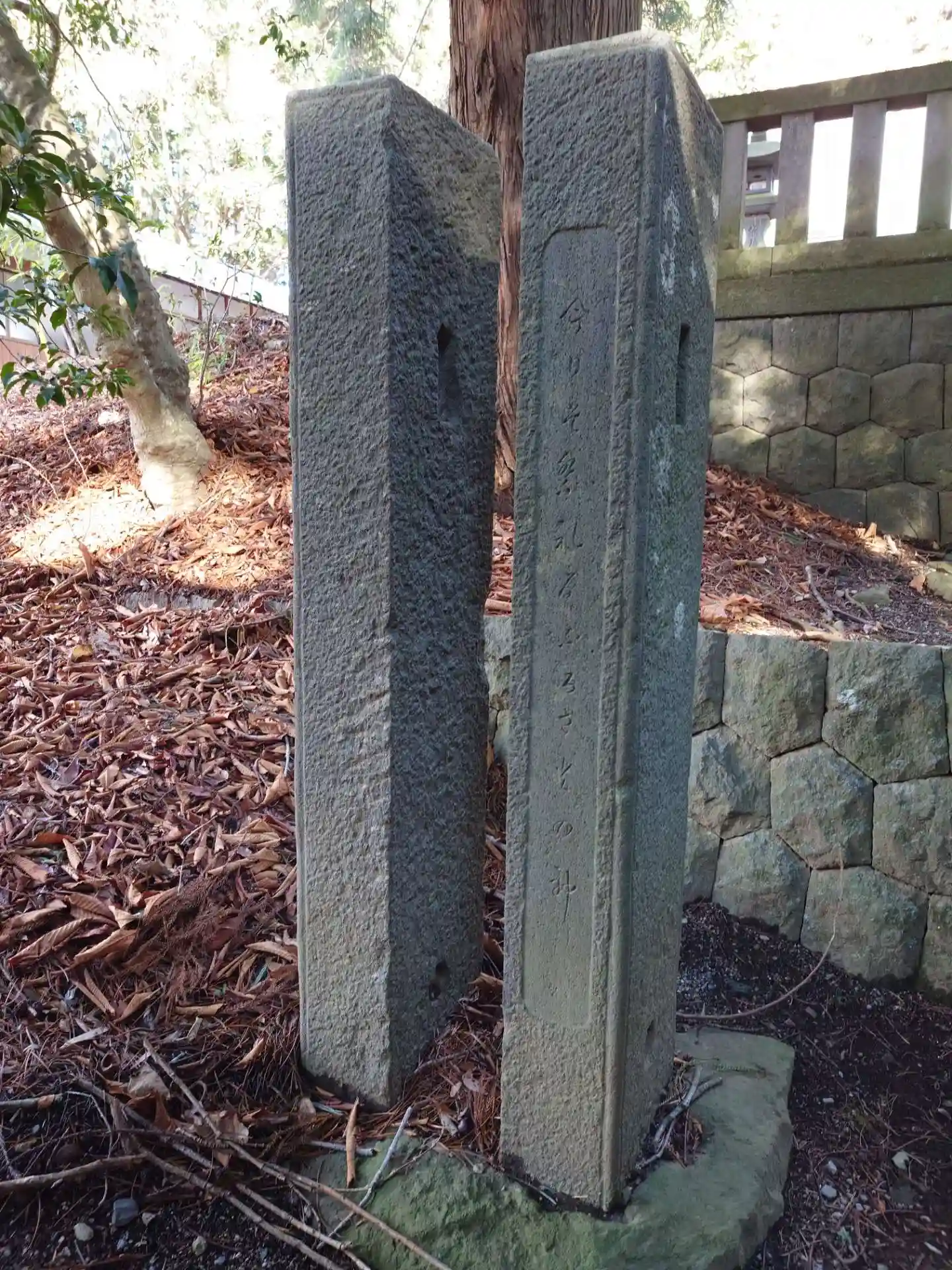 奥に見える白い新しい石祠は檜峰神社郷社