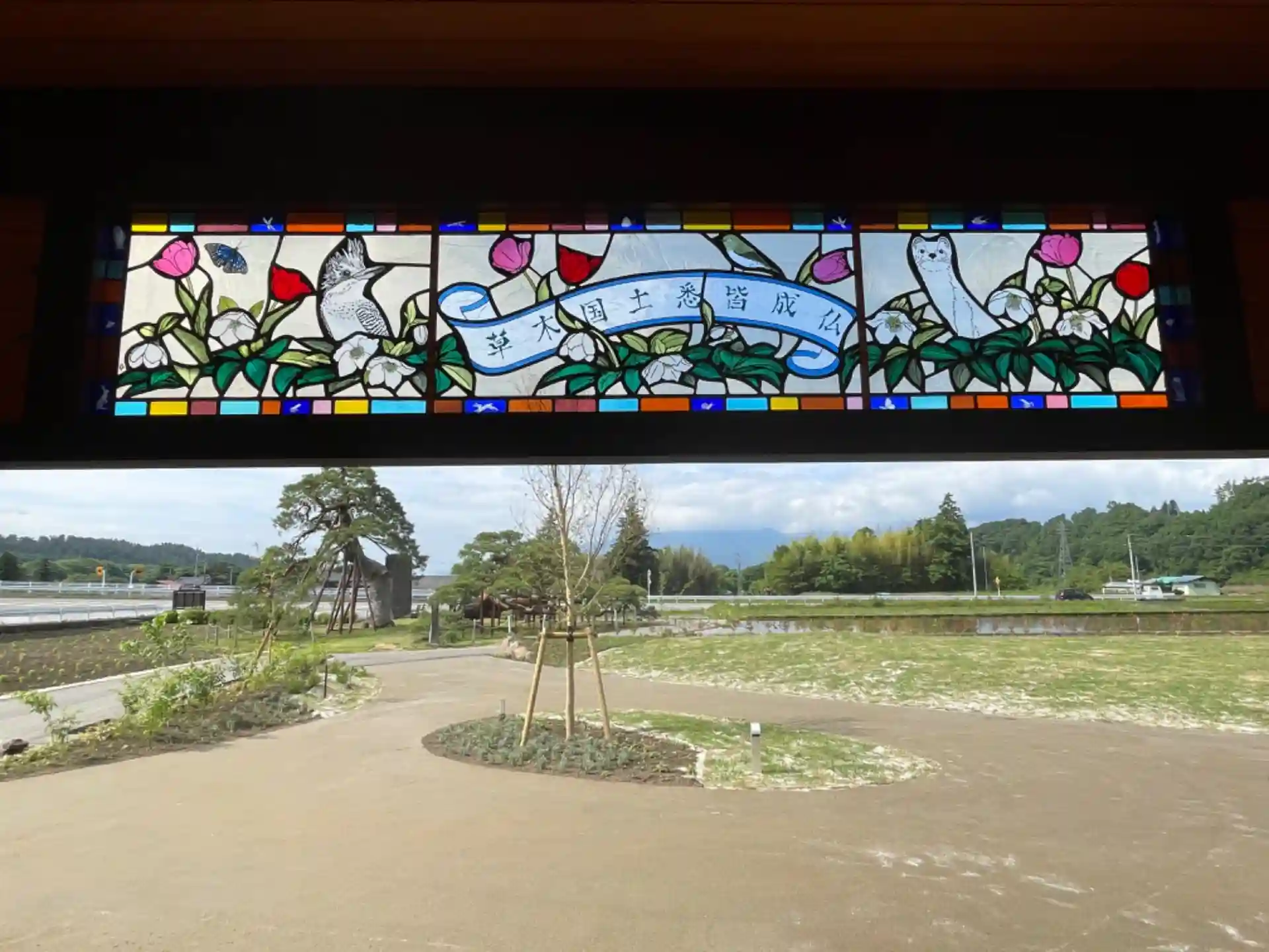 休憩所の東屋にはステンドグラスを入れて、樹齢500年の松や南アルプスの山々を見渡せる癒しの空間です。