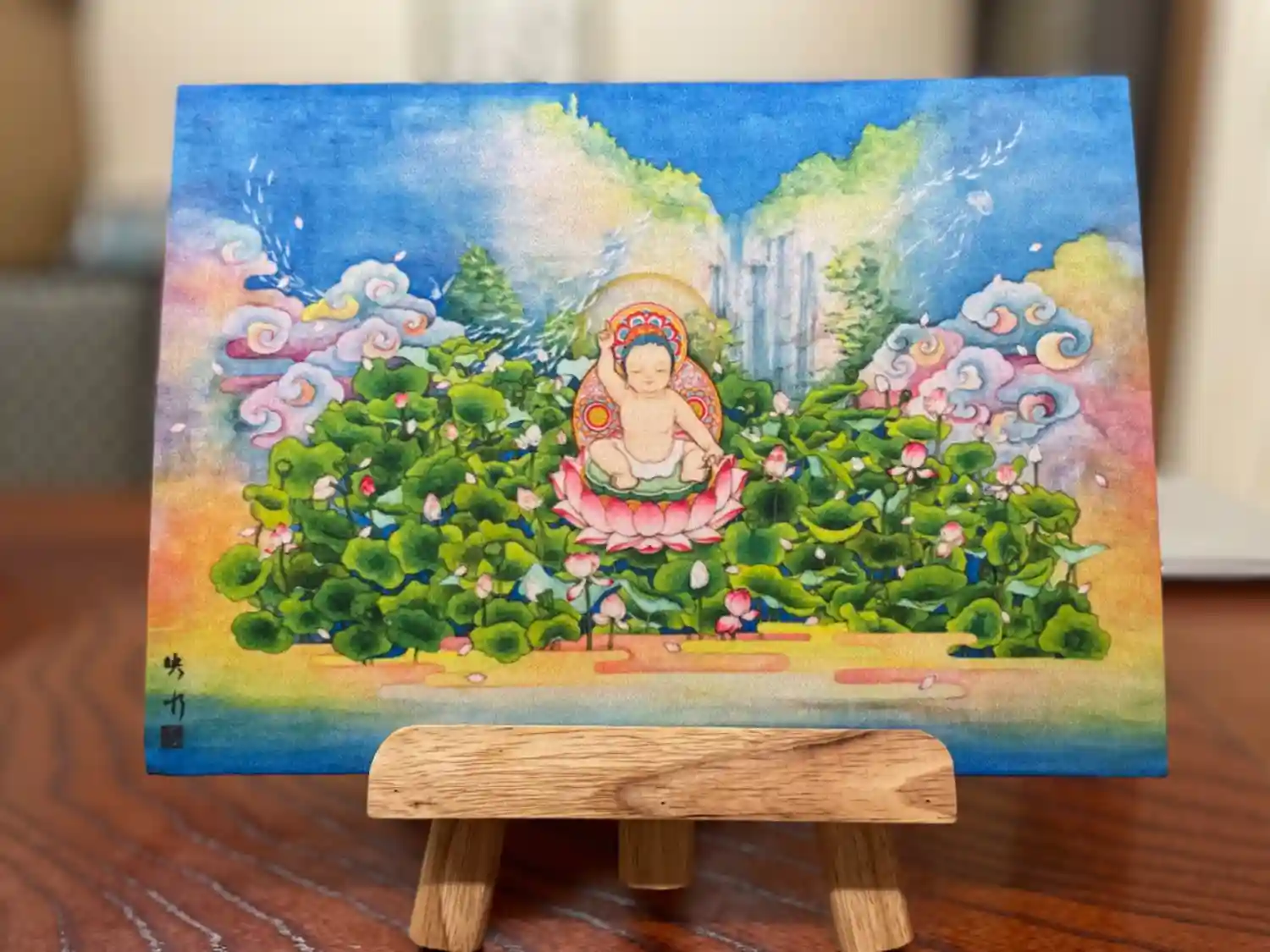 イーゼルに立てると1枚の絵画のように仕上げました。スエード調の布地張りで手触りも良いものになっています。