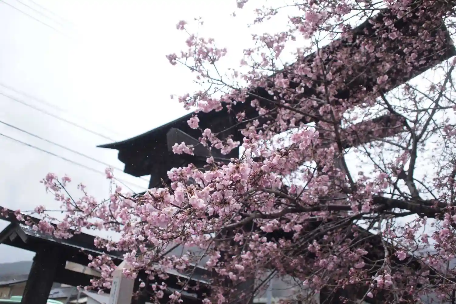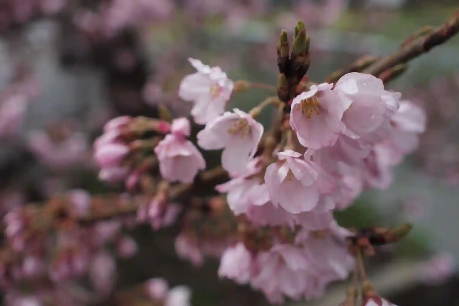 桜もしっとりと濡れて、また違う色合いを見せています。
