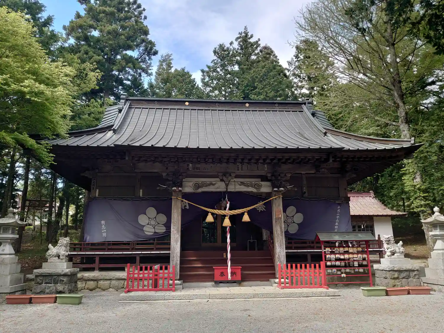 拝殿の桜の紋が印象的。