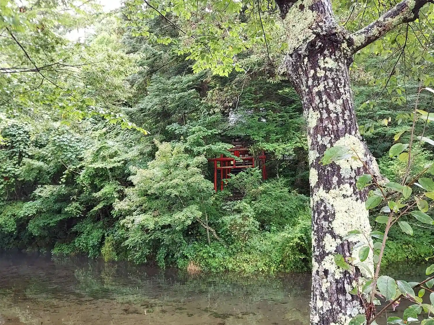 忍野八海 第壹霊場 出口池 出口稲荷大明神 池からひっそりと見える鳥居 御朱印は …