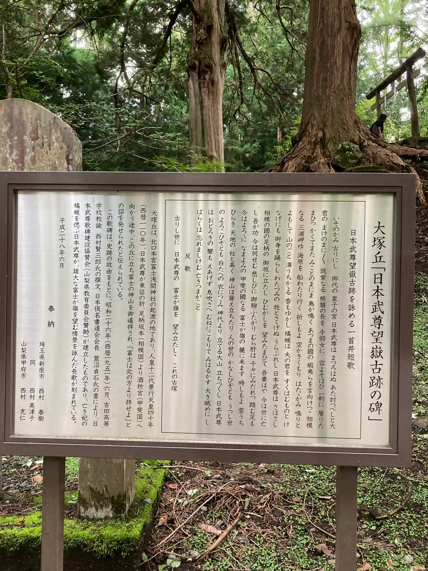 鳥居周辺に、由緒・ヒノキの説明・日本武尊望嶽古跡の碑の説明