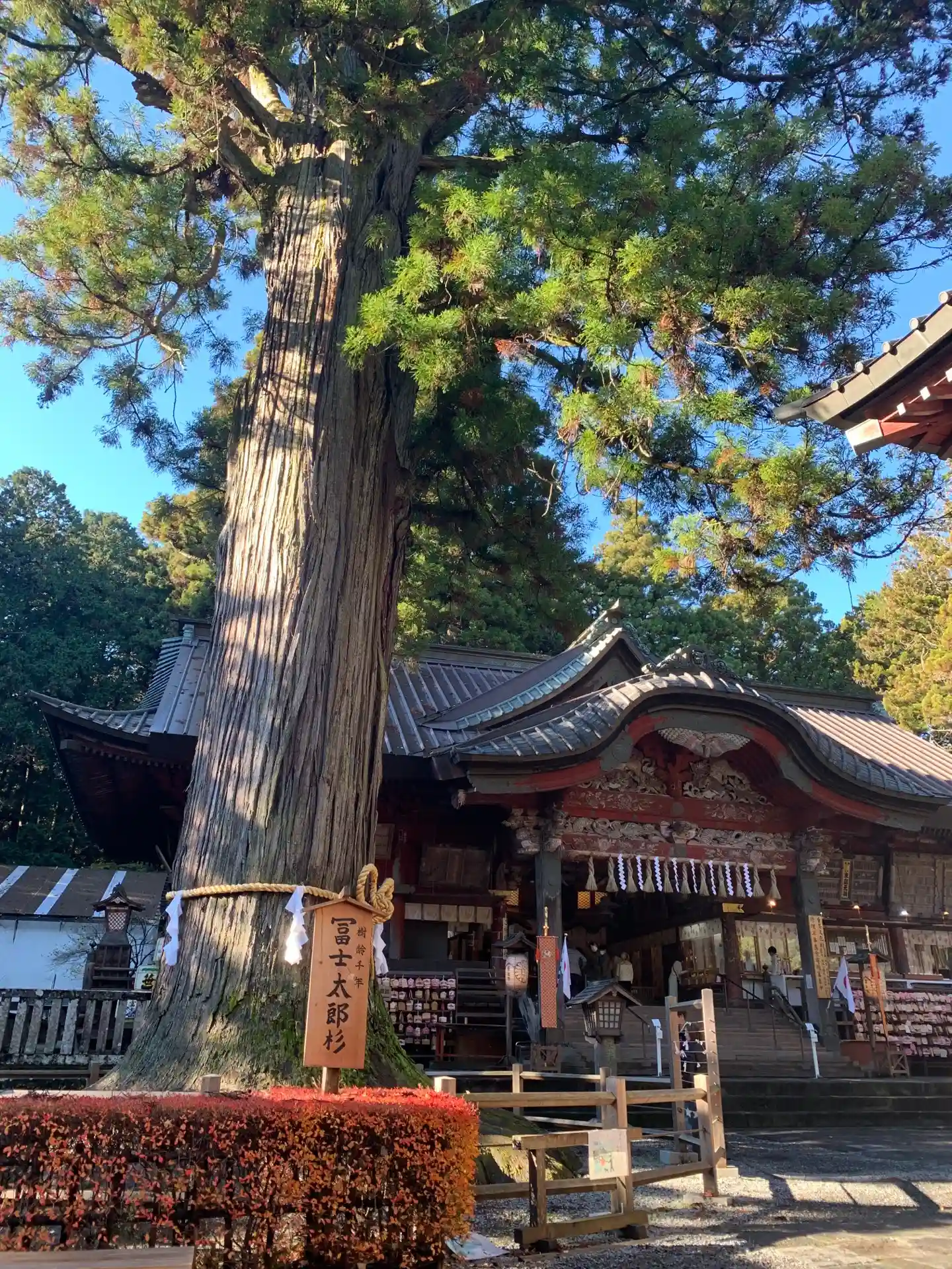 拝殿の両側には太郎杉と夫婦檜の御神木がたたずんでいます。雨あがりだったせいか?いつものことなのか?わかりませんが、境内、檜の香りがしました。