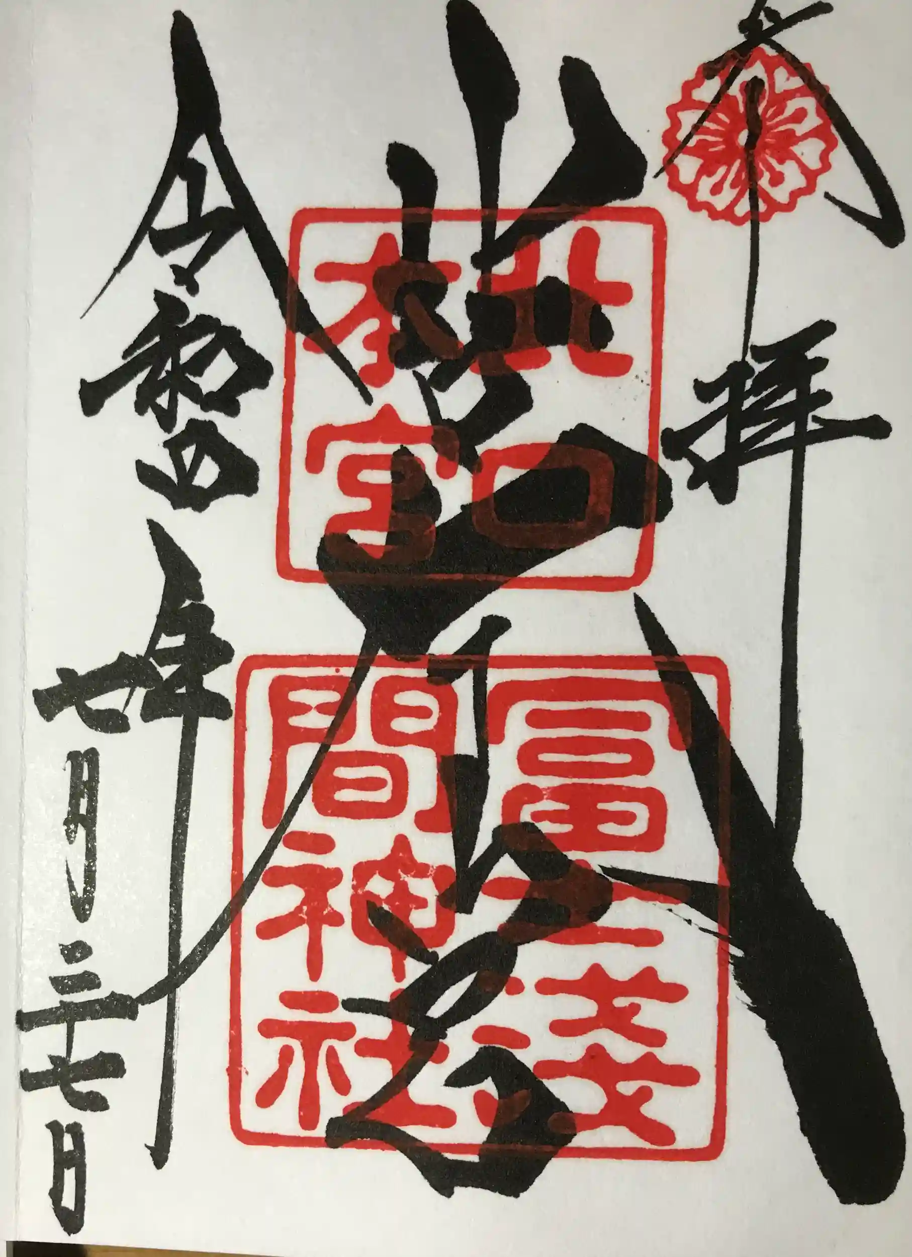山中湖から国道138号線、139号線を北西へ。国道沿いにある北口本宮富士浅間神社へ。大鳥居が見事です。諏訪神社、大塚丘の御朱印も併せていただきました。