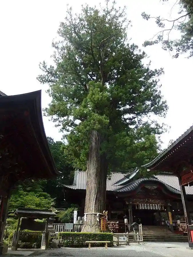 社殿のすぐ隣に、大きな富士太郎杉がある神社です。