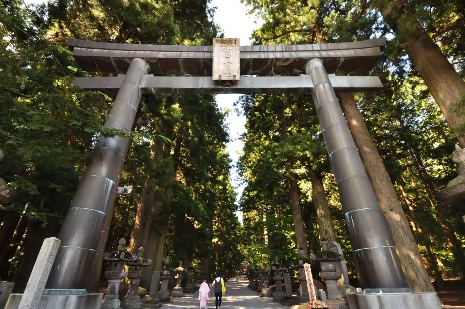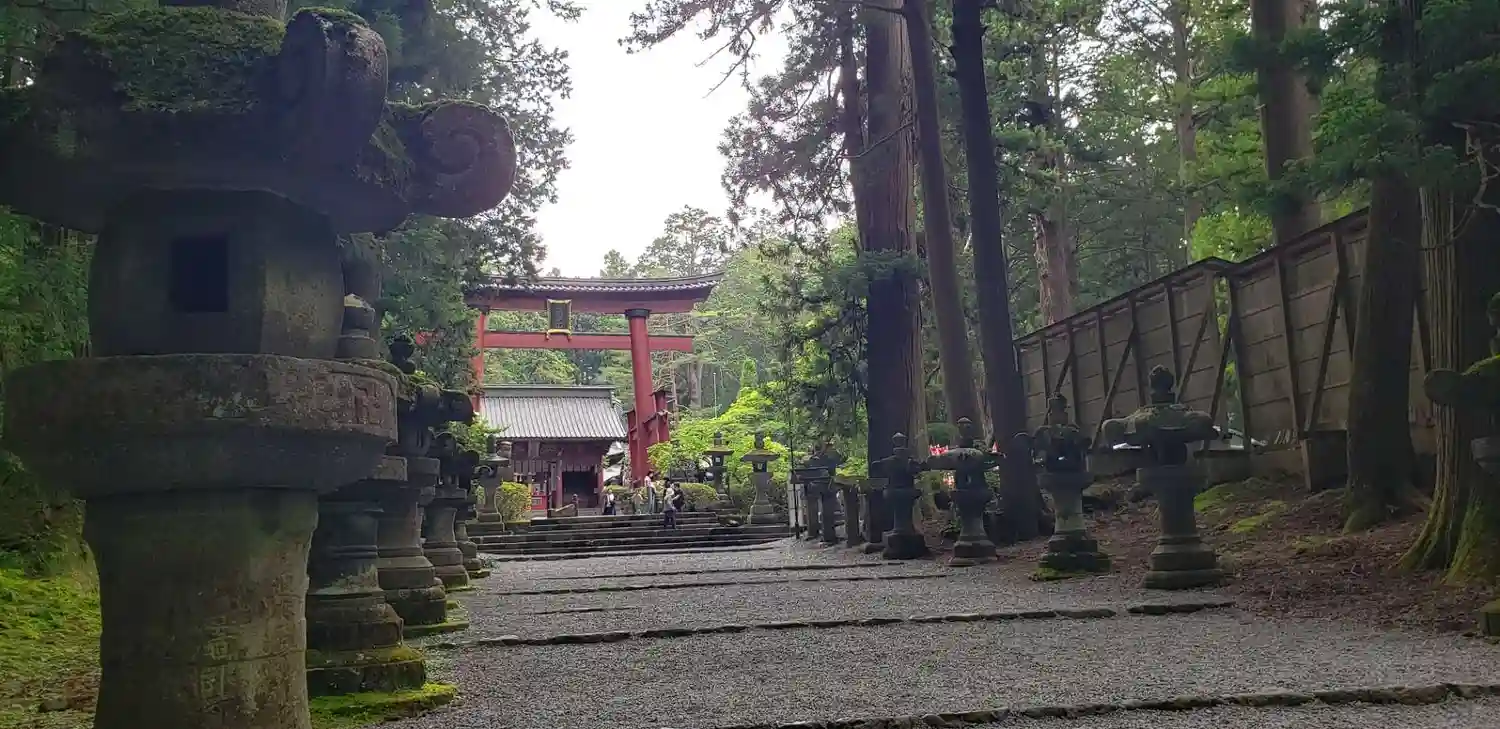 杉の巨木と江戸時代からの灯篭に囲まれた長い参道。