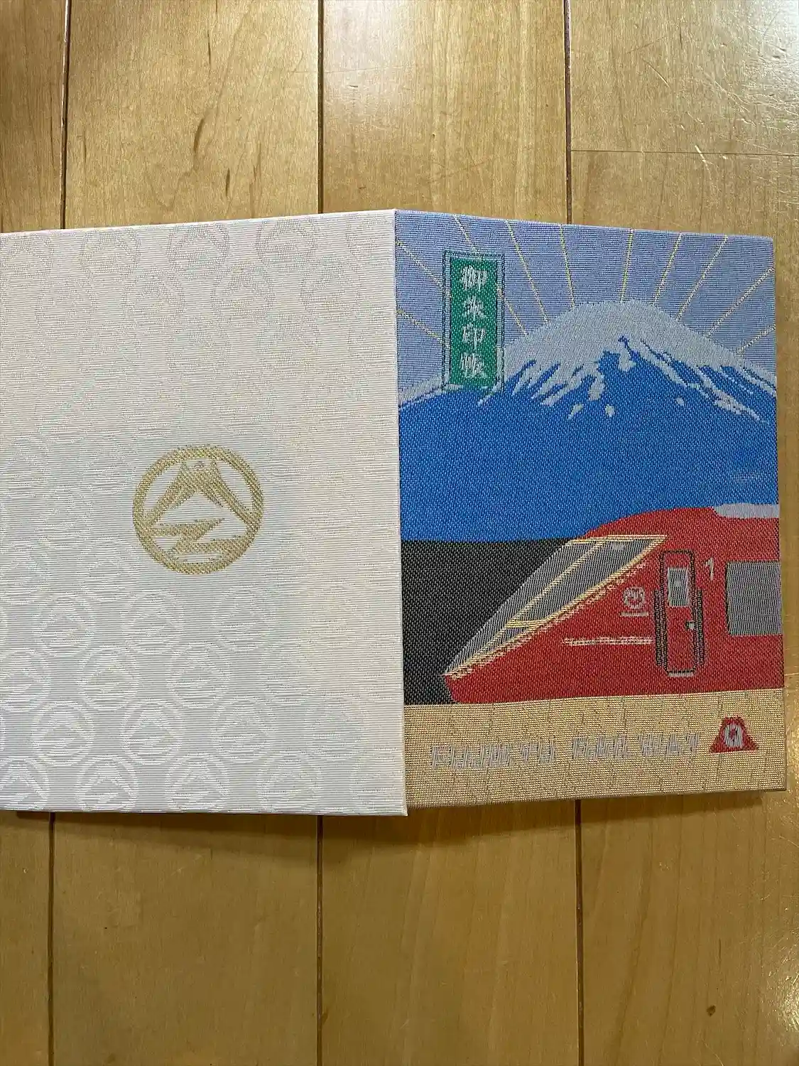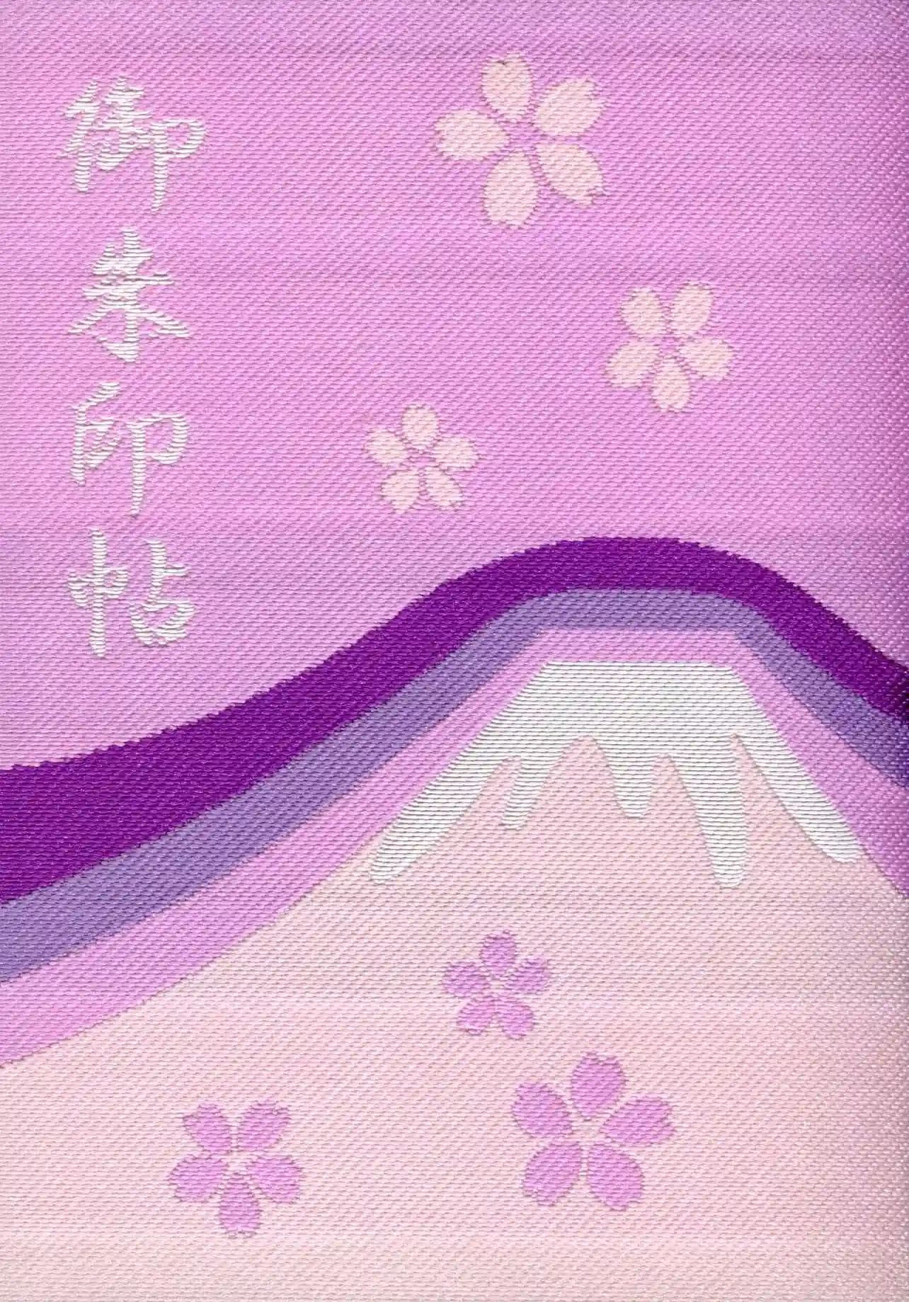 近くの河口湖駅で富士急行線開業89周年を記念し、山梨の伝統工芸「織物」とコラボした御朱印帳を頂きました。