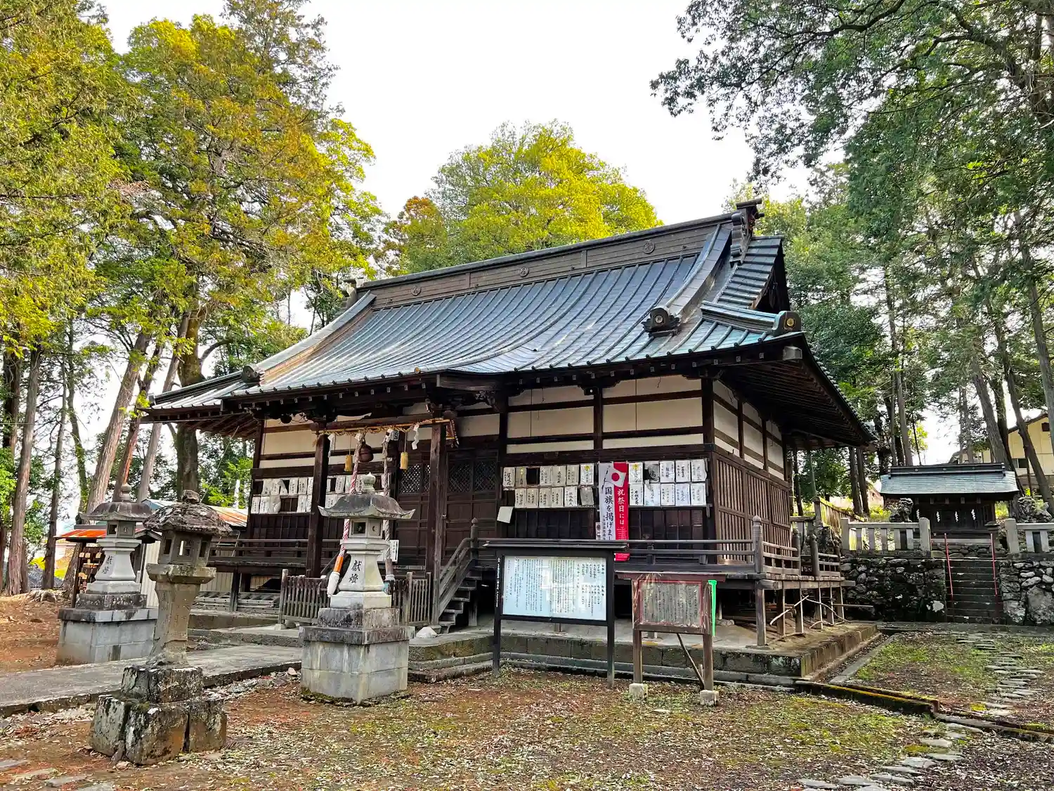 <拝殿>全景。入母屋平入り高床式寝殿造、向拝付き。中世武家住宅の様式とのこと。なかなか重厚感がある。