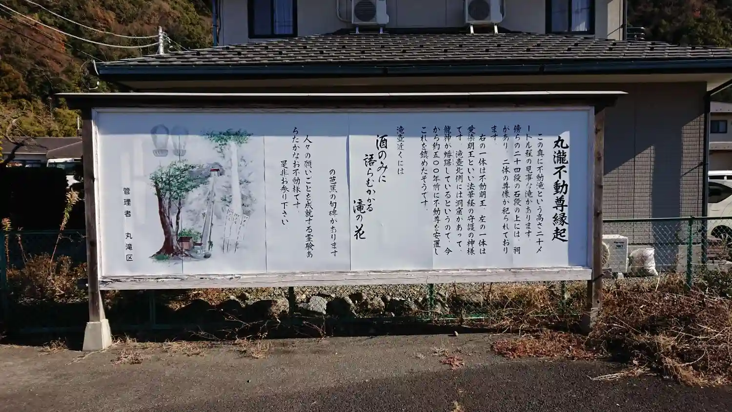 駐車場の一角に、丸滝不動尊 縁起が書かれています。