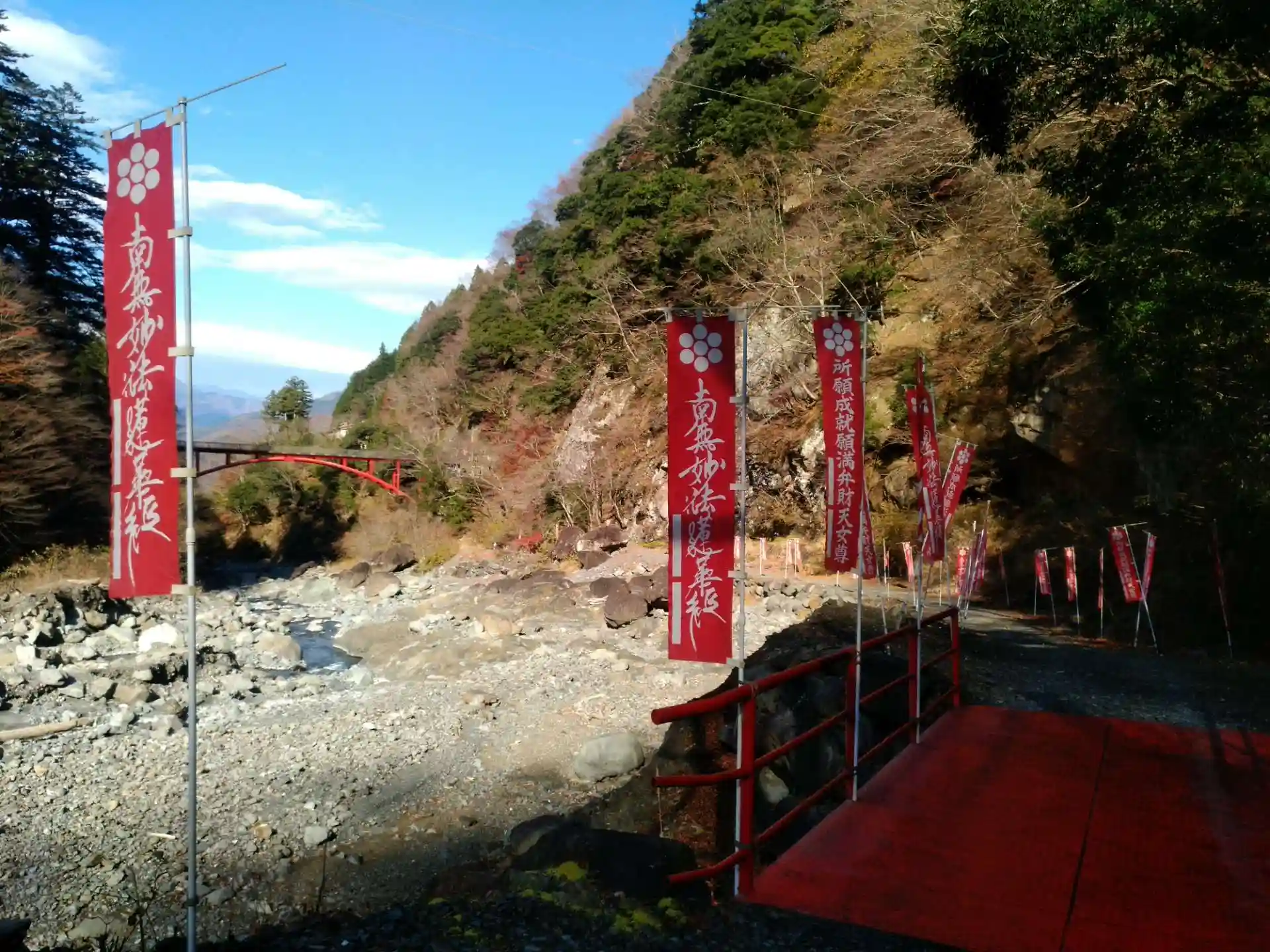 川沿いに日蓮宗の幟が立ち並んでいます。