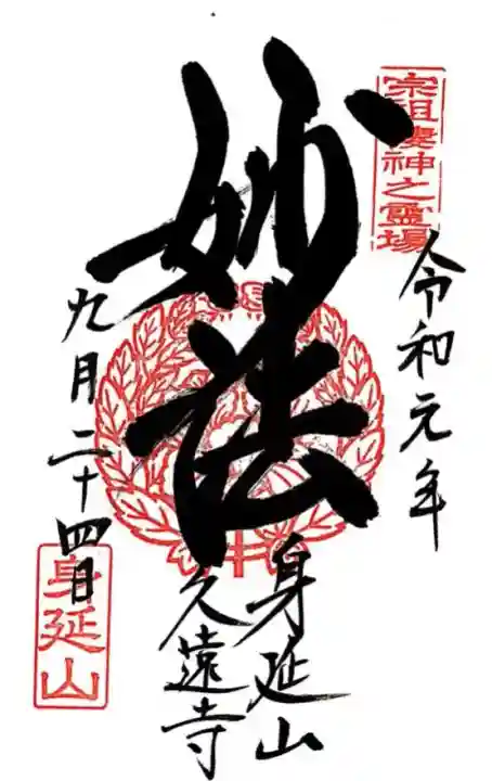 他寺社の御朱印がある御朱印帳の場合は、中央に「妙法」等と書かれた御朱印になります。