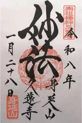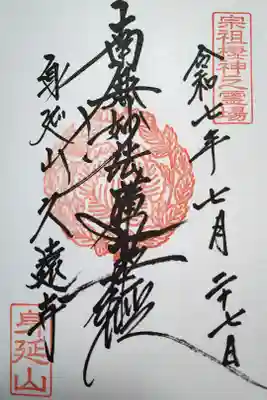 真ん中に南無妙法蓮華経と書かれ、右上に宗祖棲神之霊場の印、真ん中に社紋の印が押されています。