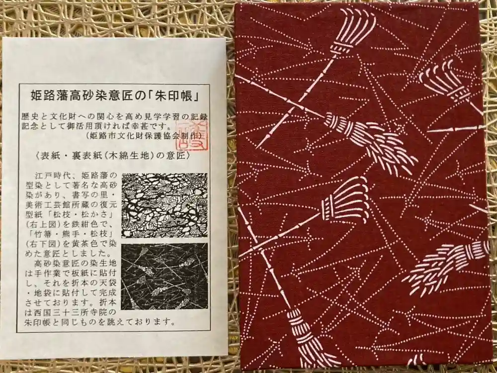 姫路藩 高砂染 意匠の御朱印帳 〈表紙・裏表紙(木綿生地)の意匠〉 江戸時代、姫路藩の型染として著名な高砂染があり、書写の里・美術工芸館の復元型紙『竹箒・熊手・松枝』で意匠としました。