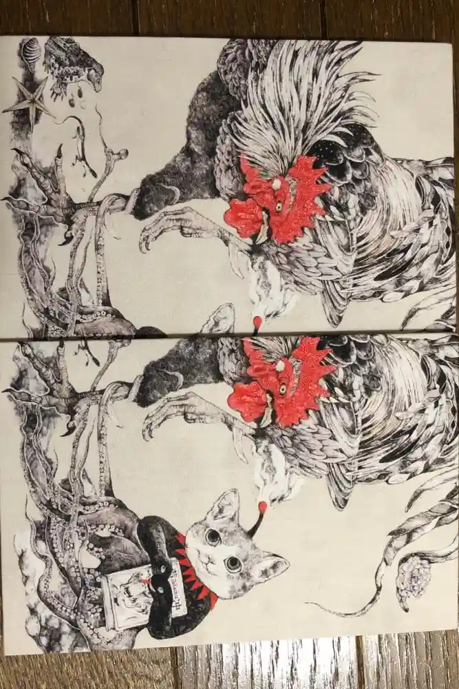 ヒグチユウコさんの若冲雄鶏図の御朱印帳です。書置きでいただいた物を貼る用に使っています。