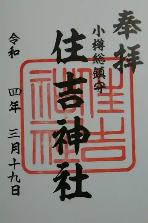 《御由緒》元治元年(1864)箱館八幡宮神主菊池重賢より「ヲタルナイ」「タカシマ」両場所の総鎮守として、住吉大神を勧請すべく箱館奉行所に出願し、寺社奉行所掛合済みの上、慶応元年6月ヲタルナイ運上屋の最寄りの地へ勧請奉祀することを許された。紆余曲折の後、明治元年御神体は社人加藤右京に護られて箱館から到着~御鎮座。 明治14年の火災直後に現在地に転地。墨江神社と称していたが明治25年住吉神社と改称。明治39年に県社昇格、昭和30年には神社本庁別表神社に指定。