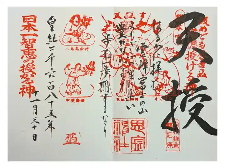 思金神社の御朱印を直書きでいただきました。私が伺った時は、朱印と文字の種類が10種類ずつあって、組合せは自由ですよと言われました。