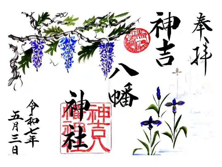 神吉八幡神社の2025年5月の月替り御朱印「菖蒲と藤」です。